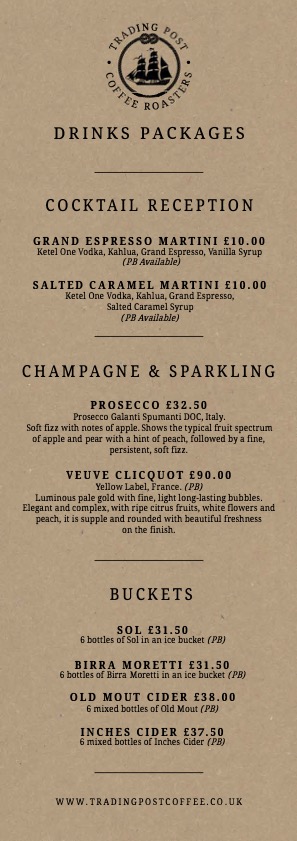 | Saturday | 19:00 | 1:00 | Private Hire Only. Available at all our Trading Post venues, Brighton, Lewes and Chichester. |