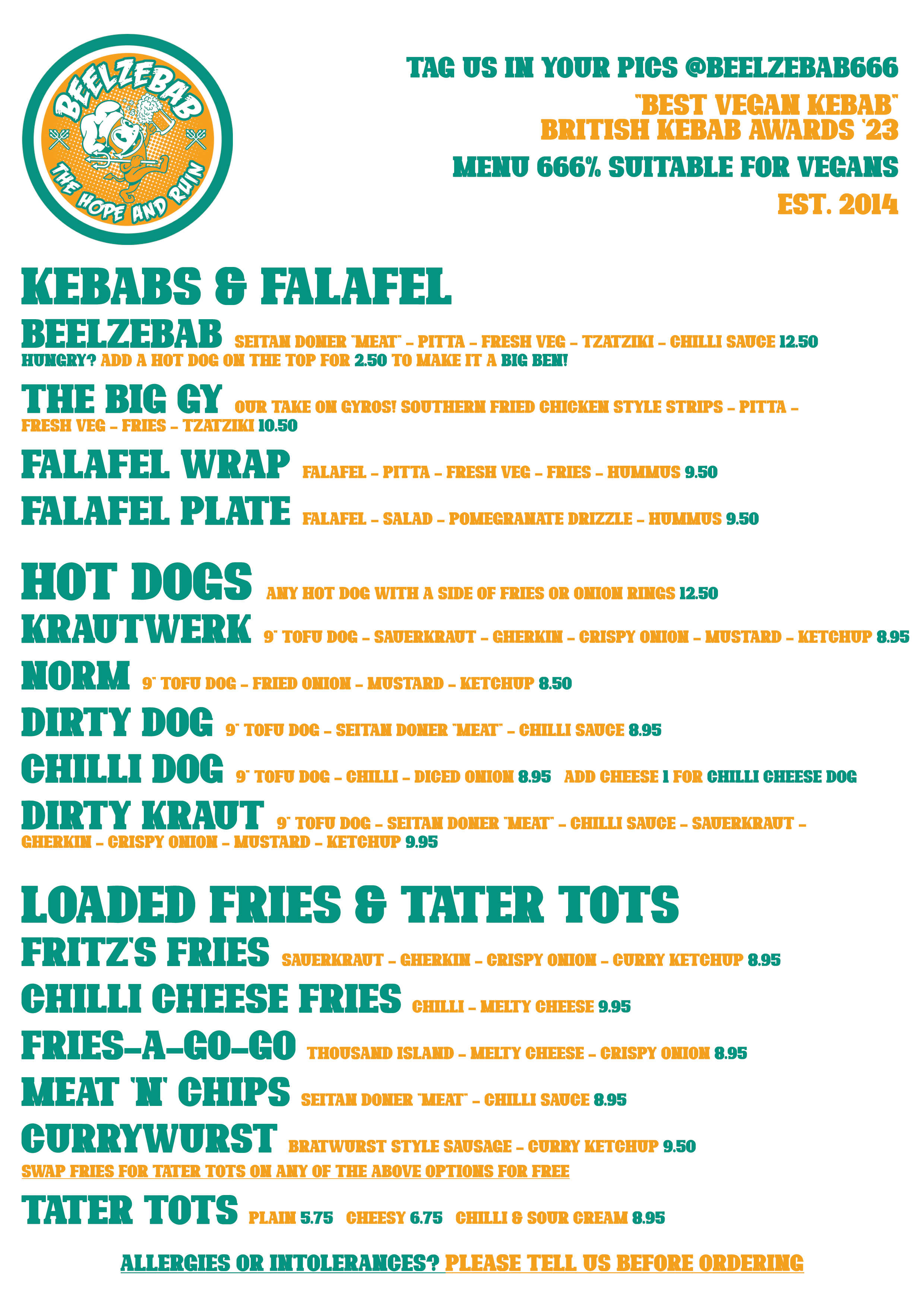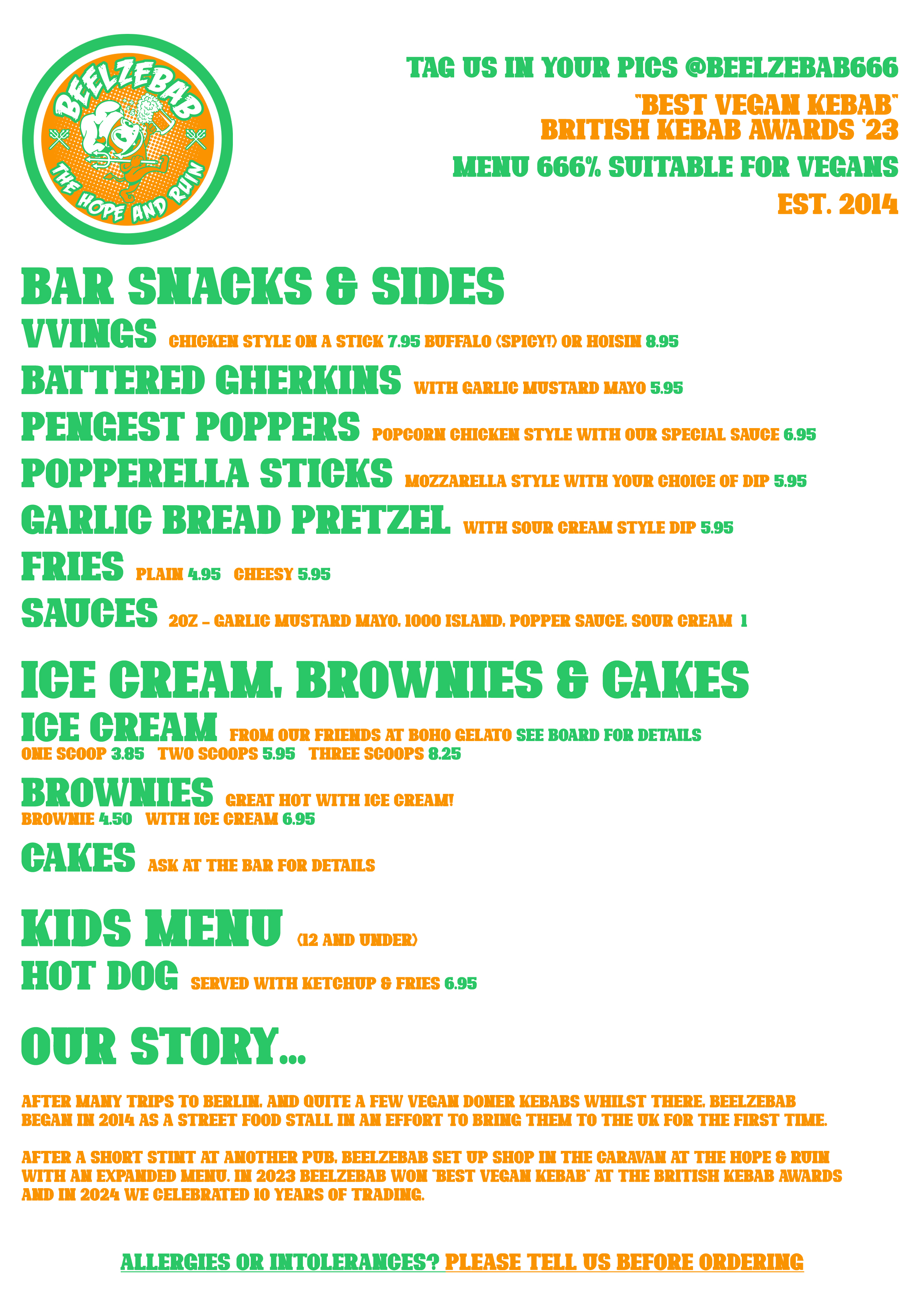 The caravan in the corner is home to the BEELZEBAB kitchen who offer the finest cuisine which is also all plant based. Including their infamous award winning kebab, loaded fries and hot dogs. As well as brownies and Boho Gelato ice cream. Keep your eyes peeled for monthly specials and new additions to the menu as well as special events like the Curryoke they host once a month.