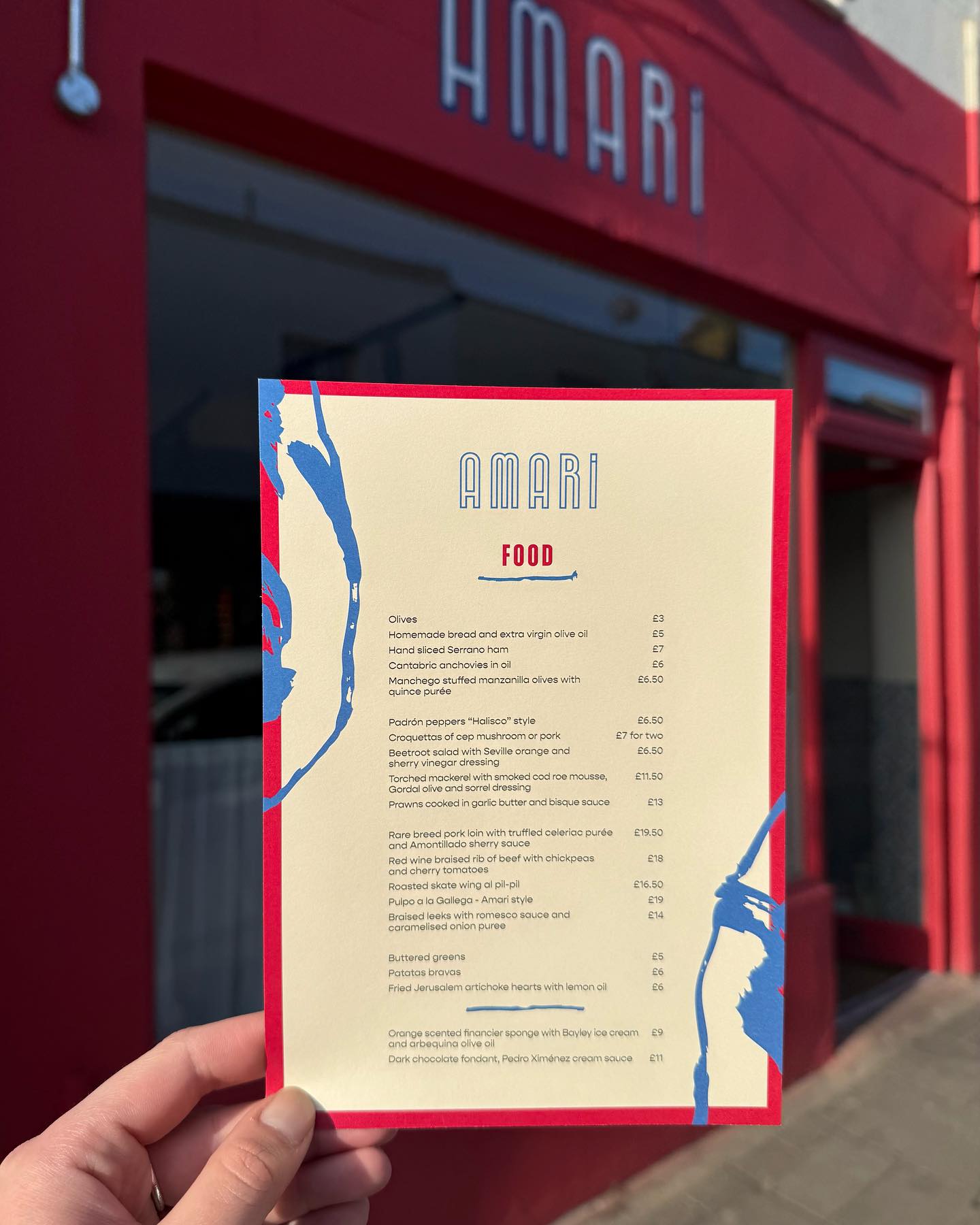 Tucked away on Baker Street near Brighton’s Open Market, Amari is a lively, neighbourhood‑favourite that brings the warmth and generosity of Spanish dining to the city. With its bright red frontage and relaxed, buzzy atmosphere, the restaurant strikes the perfect balance between casual and considered. Inside, the room is intimate and welcoming, with a semi‑open kitchen that keeps the focus firmly on the food and creates a sense of connection between chefs and diners.