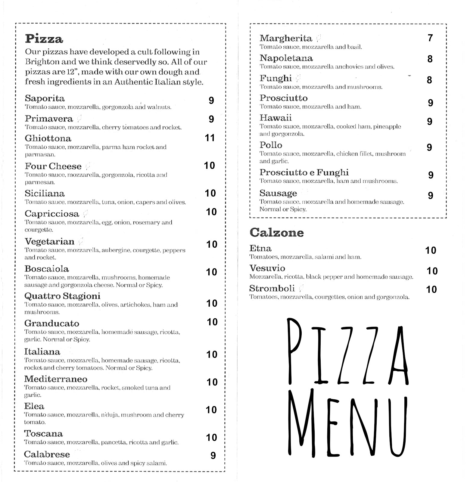 If you would like to pre-order some food, choose your Pizza from our menu and either call us on 01273778105 or email info@artistacafe.gallery to let us know and we will have it ready for you when you arrive.