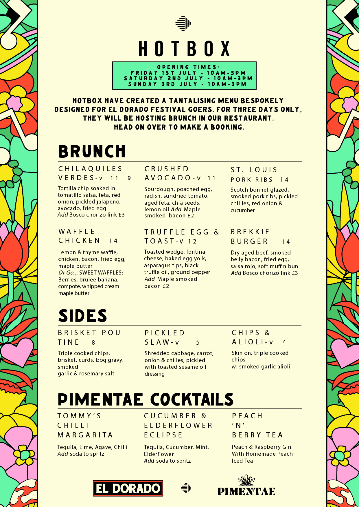 Hotbox have created a tantalising menu bespokely designed for El Dorado festival-goers. For three days only, they will be hosting brunch at the festival. We are now taking bookings.