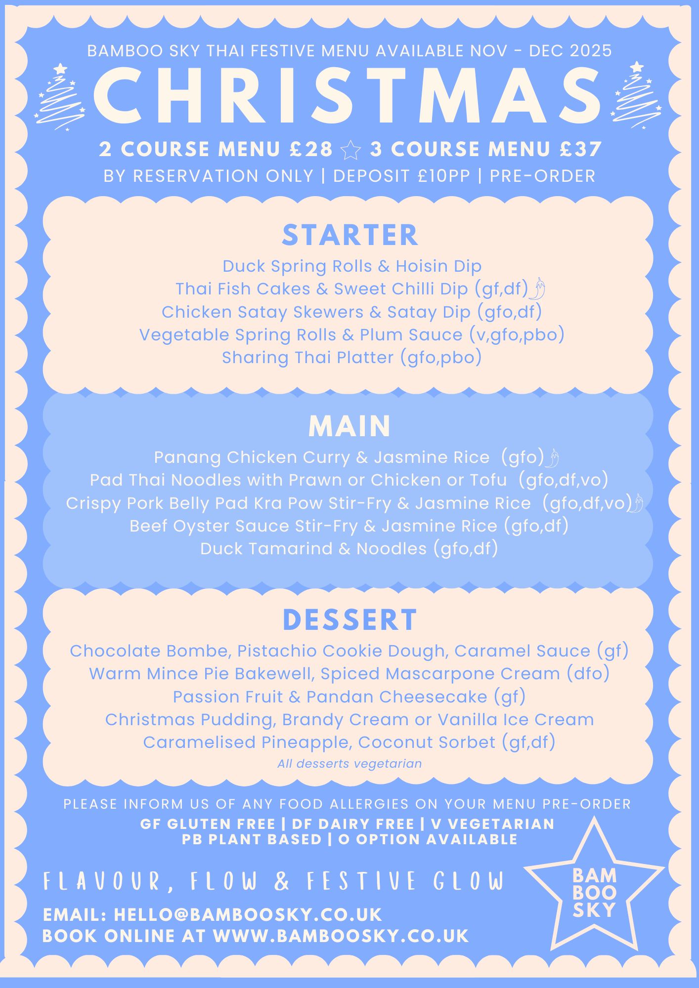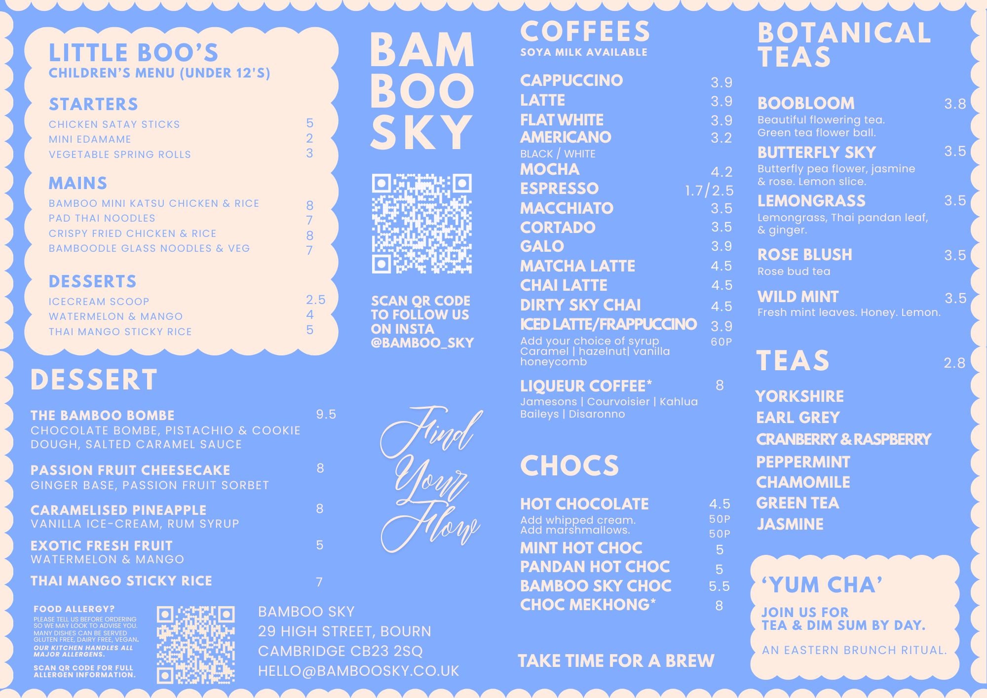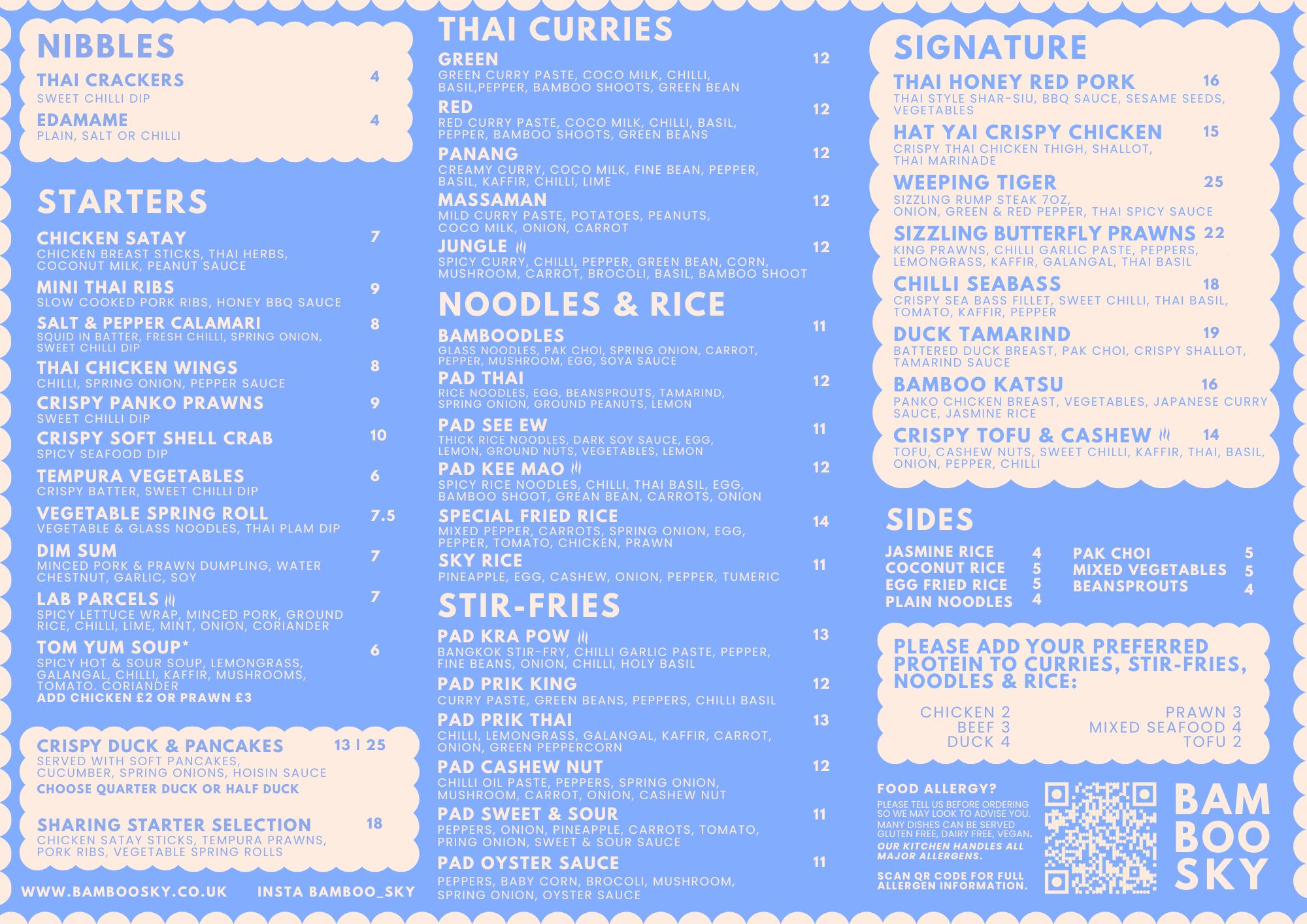Our menu is all about fragrant Thai flavours, fresh drinks, and a gentle sense of adventure. Expect sharing plates, dim sum, noodles, vibrant curries, sizzling signature dishes, colourful cocktails & botanical teas, all crafted by our family team of Thai chefs. If you’d rather stay home, we’ve got take out too, so you can take a little Bamboo Sky with you.
