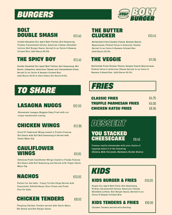 You'll find Bolt Burger in the kitchen, cooking up a range of scrumptious burgers, loaded fries and sides. Plus, the basement space is a perfect private snug in the centre of the Liberties, available for all kinds of private events and parties.