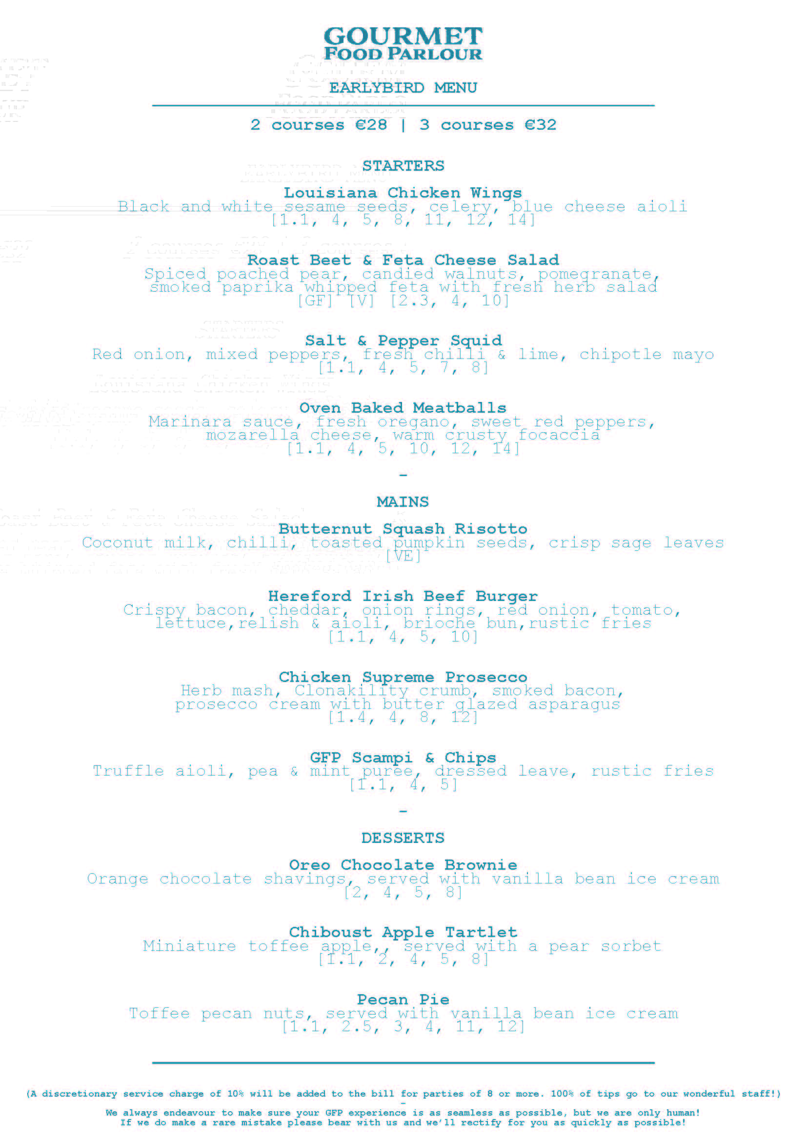 Their daytime menus range from breakfast to lunch, with a brunch menu available Thursday to Sunday. Top that off with their daytime specials menu, tapas selection and early bird offers, and Gourmet Food Parlour Dun Laoghaire has so much to offer whether it's a lounging meal, quick coffee run or post-work drink.