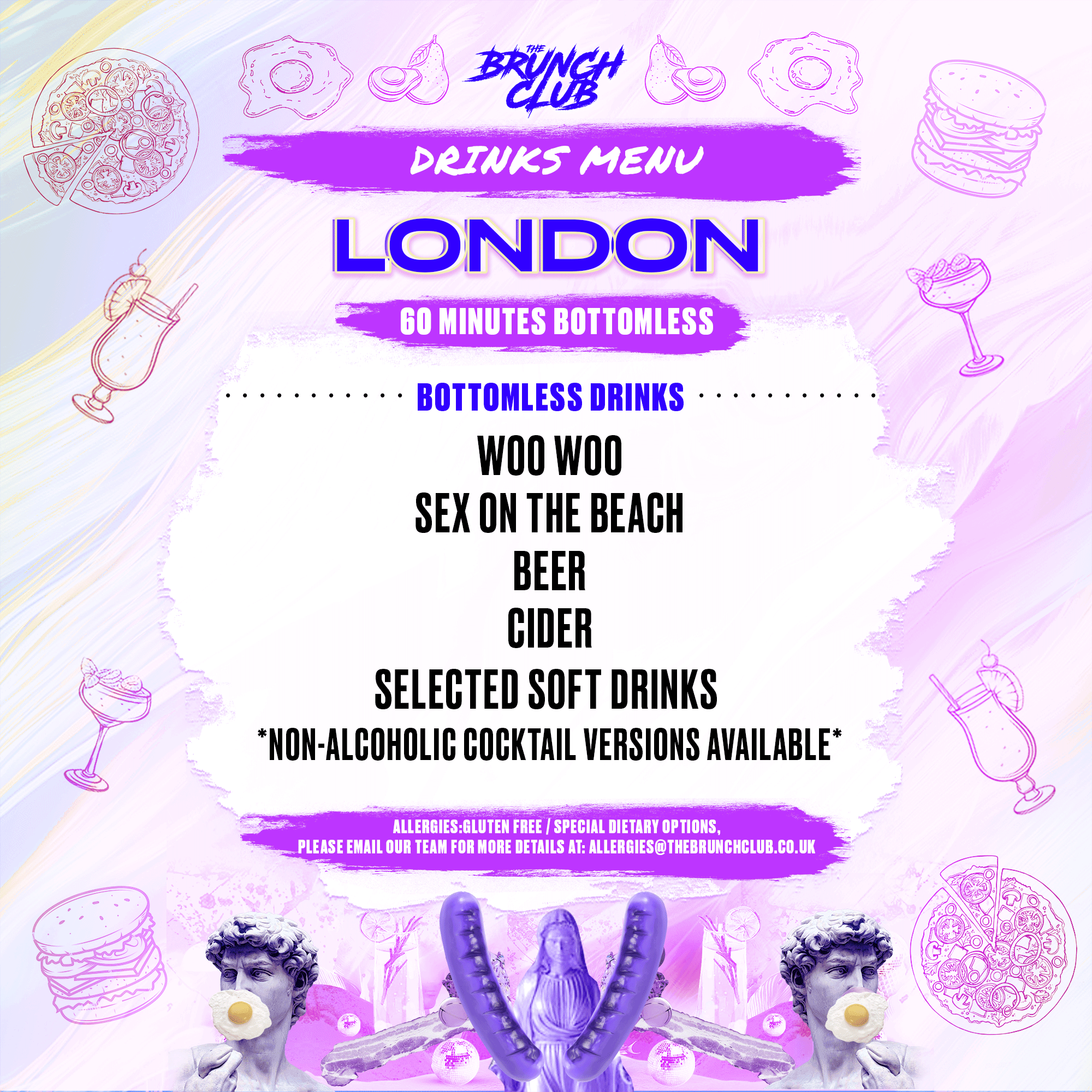 Food orders must be correctly submitted on checkout. Your food orders cannot be changed at a later date and your order submission is final. Due to the volume of food orders we can't adapt, amend or change any meal dishes in advance or on the day. If you have an allergy, please select this option on checkout and email your allergy to us at: allergies@thebrunchclub.co.uk - one of our team will then respond accordingly/ make a note of it for the relevant venue you're attending.