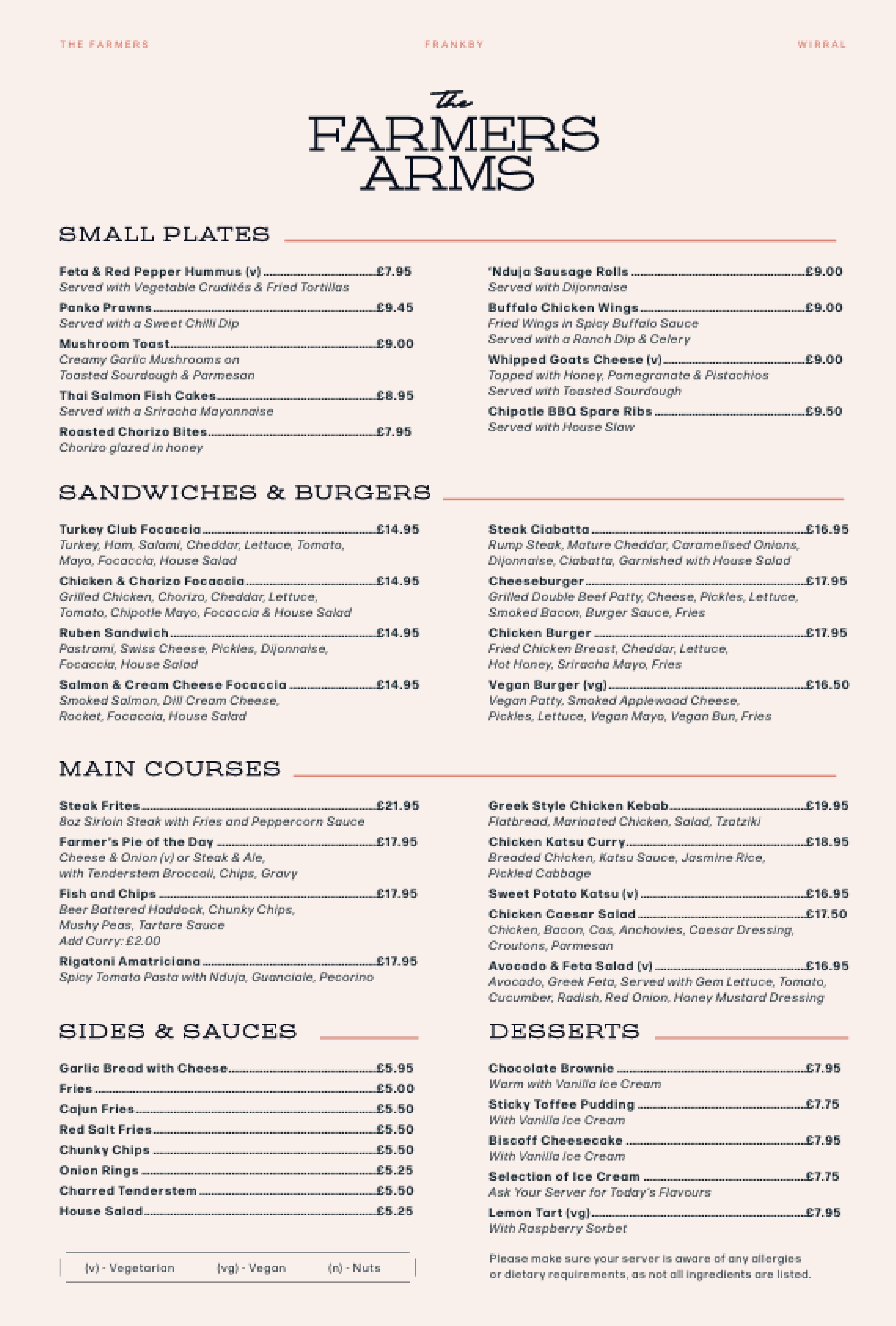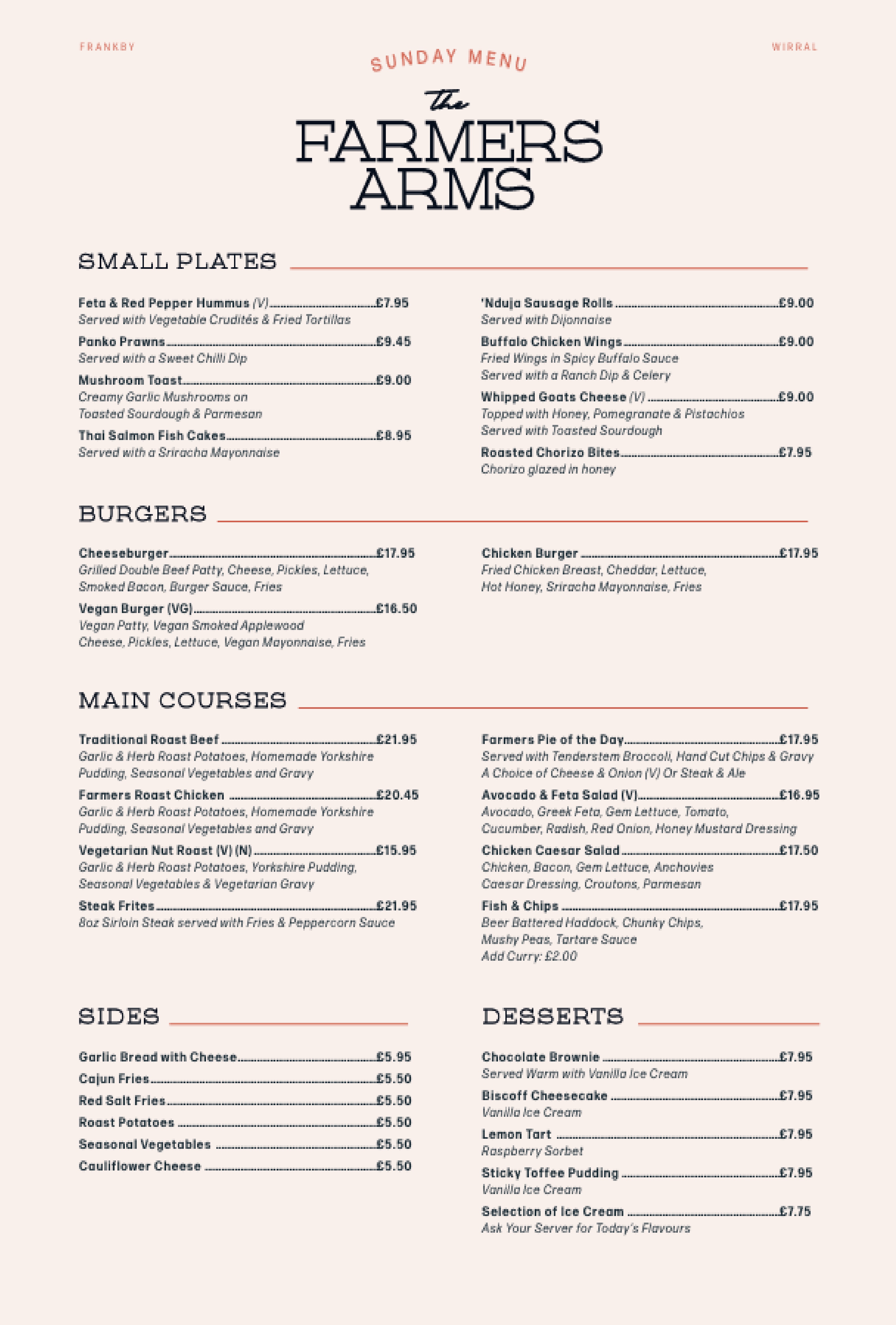 Welcome to the Farmers Arms, Frankby – the Wirral’s Favourite Country Pub. Head down for our delicious pub menu packed with all your favourite dishes, all cooked with the freshest locally-sourced ingredients. We have a little something for everyone, from a wide range of small plates, to some delicious main courses that are sure to be a future favourite.