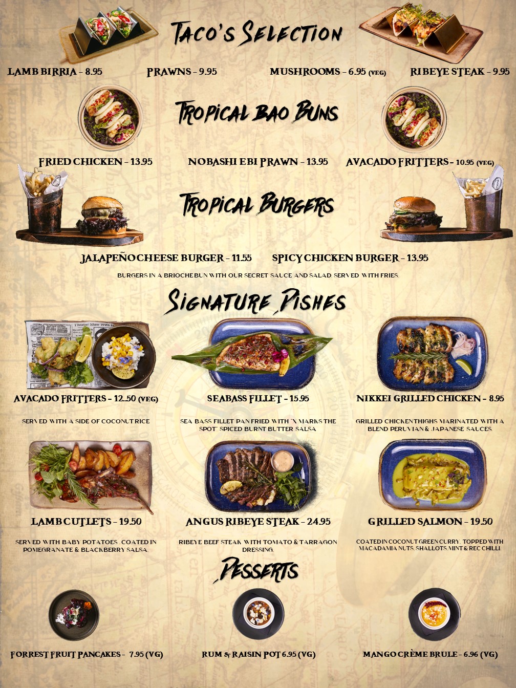 Stunning Tropical décor throughout, South American and comfort dishes, Tiki Cocktails, live DJ's and entertainment from early hours of the famous wild brunch all the way to the late hours of the evening.