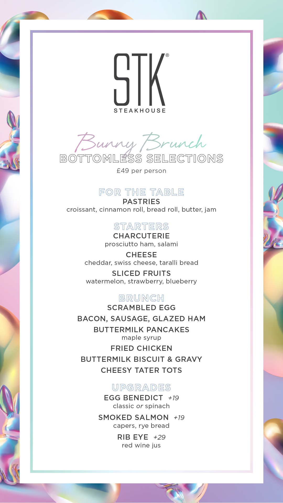 Access to the venue from 12pm. Bar & Terrace access Bottomless only available with table and main course. Please email stkstrand@togrp.com to book your dining table. |