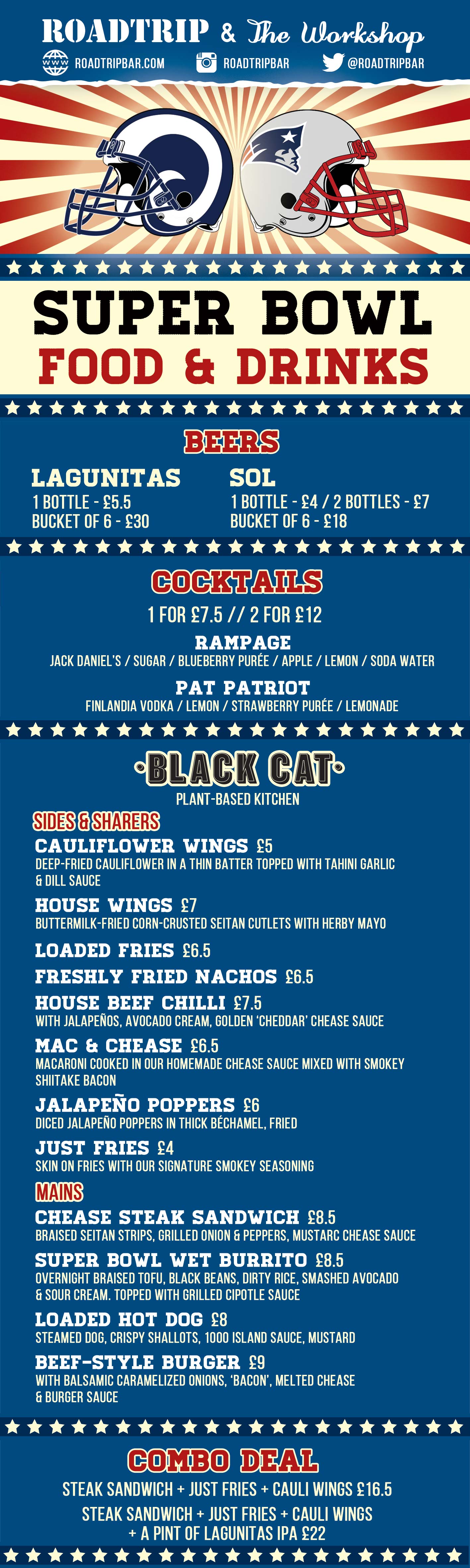 There’s no better place in Shoreditch to host your Super Bowl 2019 get-together and Roadtrip & The Workshop is expecting a full house of likeminded NFL enthusiast and their American friends celebrating this sporting showdown over buckets of beer, themed cocktails & bites until late.