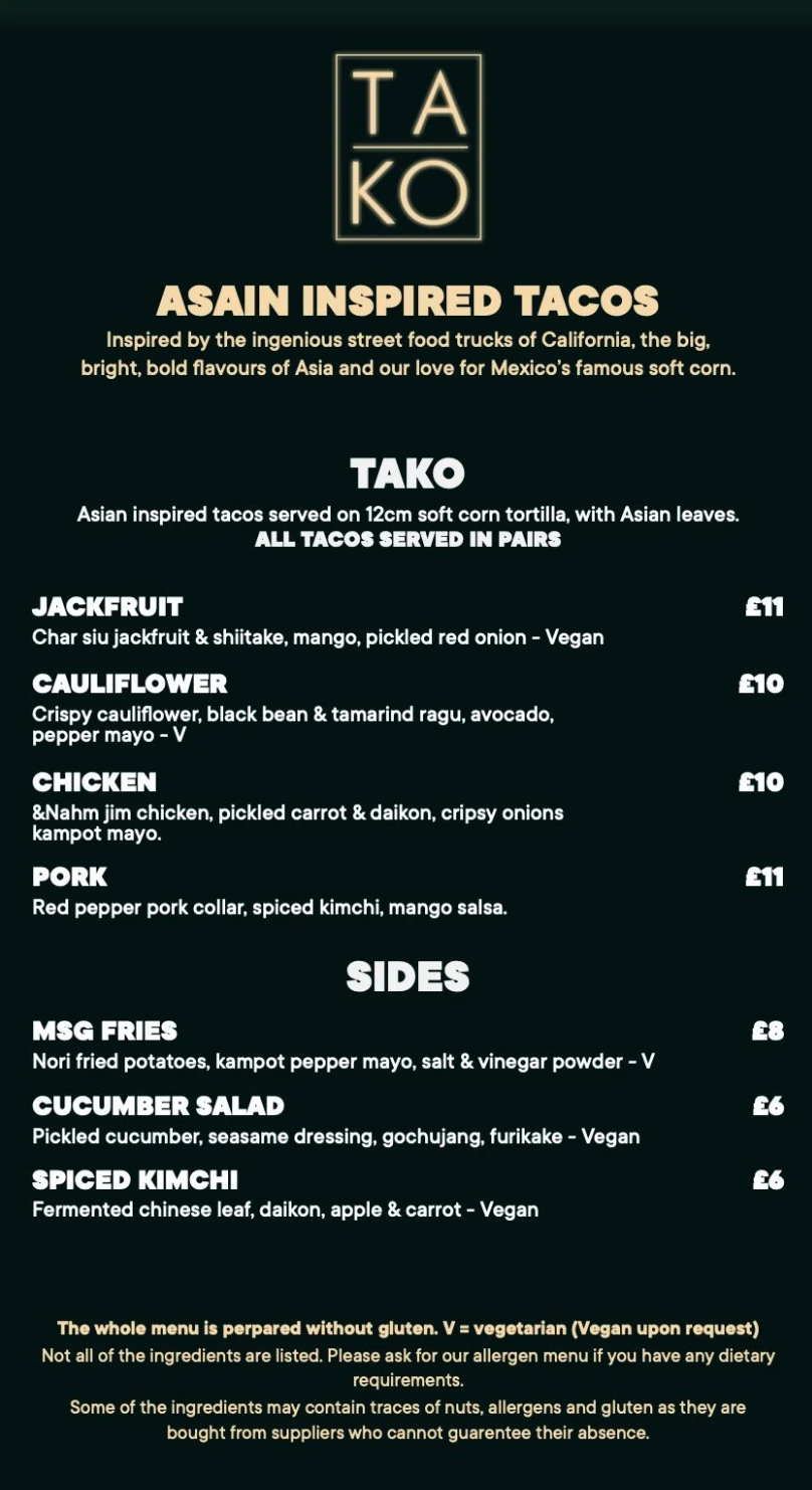 Capacity: 110 guests (dependent on furniture layout) Hire fee: £1000 minimum spend, £200 refundable deposit Preorders for drinks and Tako tokens available upon request