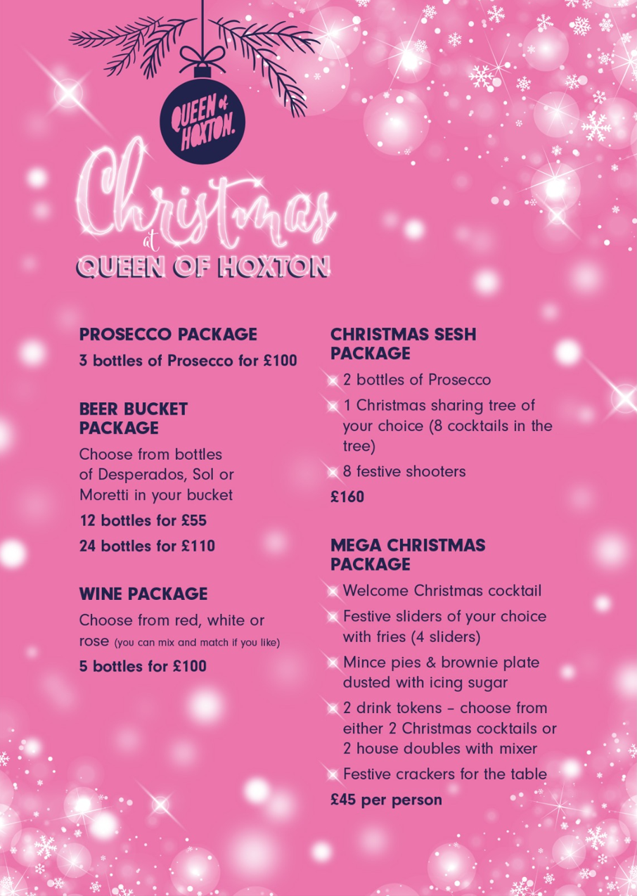 You can make a booking and order your drinks and nosh as your wish, however for an unforgettable Christmas 2021 why not add on one of our party packages to your table or area booking. Choose from:
