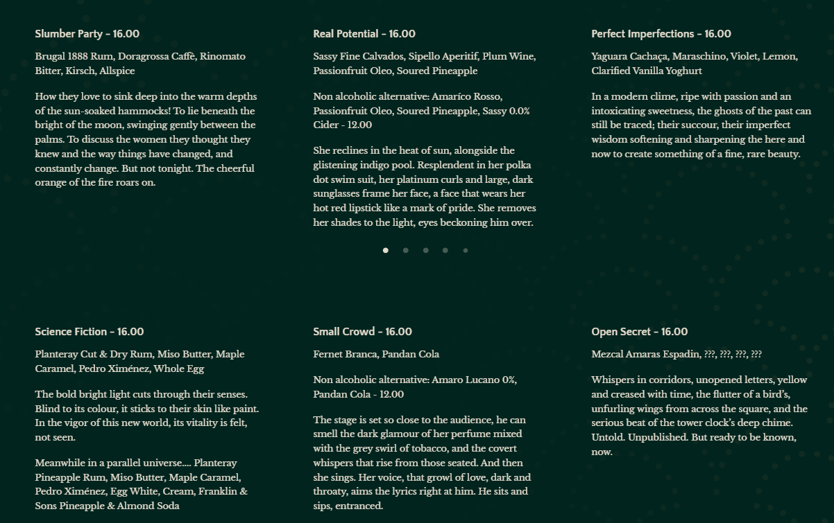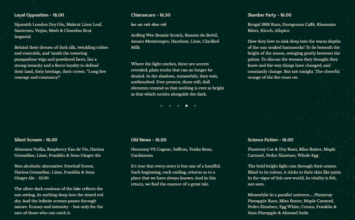 A hidden gem of a basement nestled under Kingly Court between Carnaby Street and Beak Street, Disrepute (D.R.P.) will welcome guests with warm hospitality and impeccable service. Offering an expertly curated drinks menu, where established ideas meet modern thinking, cocktail lovers are well looked after while a luxurious collection of spirits and an extensive wine list will appeal to the discerning and the adventurous alike. Cocktails are presented as a series or short stories, invoking the characters and events from Soho's heydays. Choose by the story that connects with you the most or simply skip to the appendix for a straight up account of each drink.