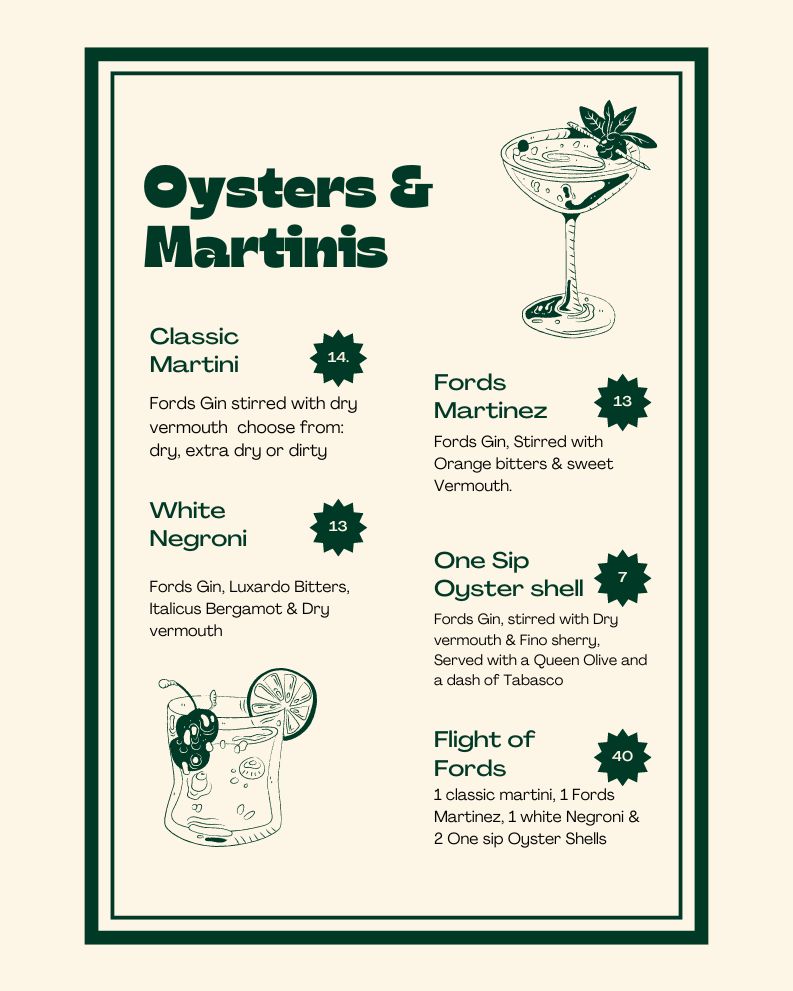 There will be plenty of great martinis to choose from, so if you like yours dry or dirty then we have you covered. With tickets priced at £20 pp its time to grab your ticket now. Tickets include a One sip Osyter shell martini, A cocktail from our Ford's Gin Menu and of course Oysters.