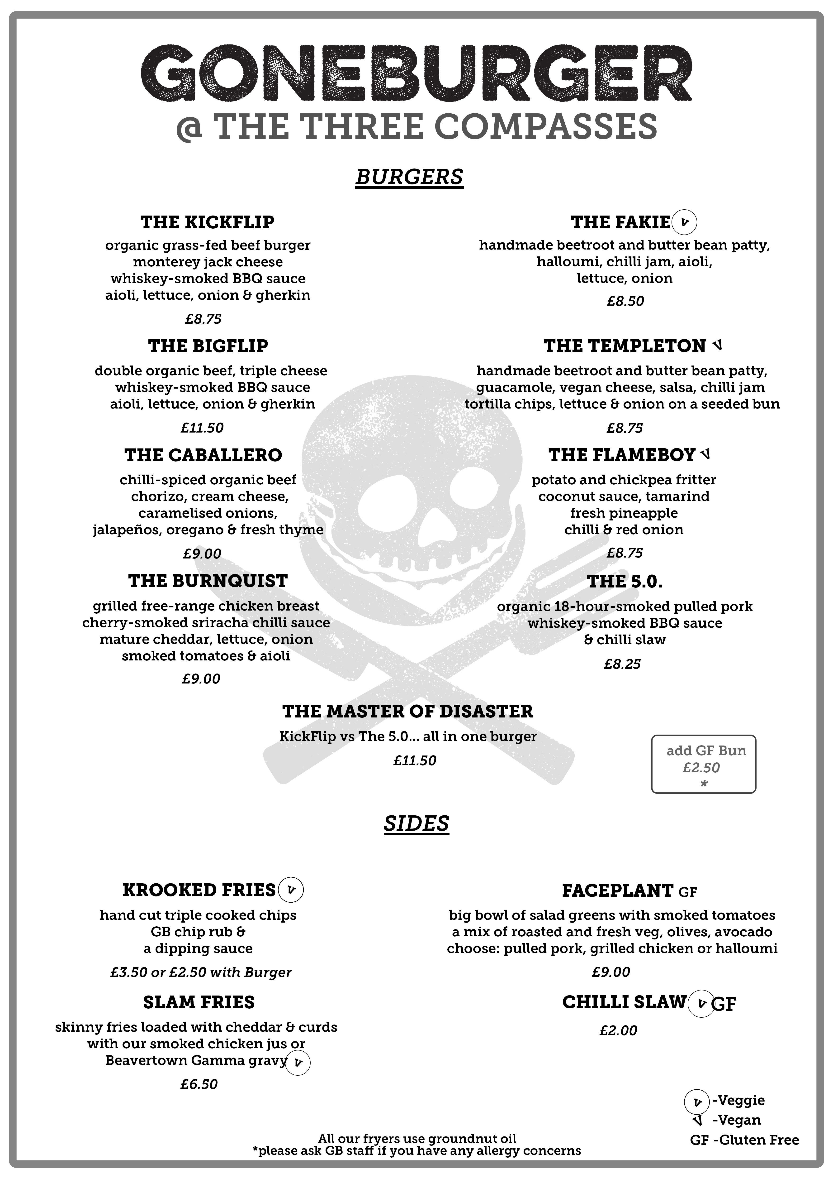 GoneBurger make incredible burgers with organic, free-range meat, the best vegan burgers we've ever tasted (they have 2 on the menu as well as an awesome veggie one), slam fries loaded with cheddar & curds and a choice of either smoked chicken jus or veggie gravy made from Beavertown Brewery’s Gamma Ray APA. There’s the Faceplant for all you gluten free people too. All of their sauces are homemade, and they smoke their cheese and meats themselves too. Did we mention we’re very excited? I’ve attached a copy of the menu…