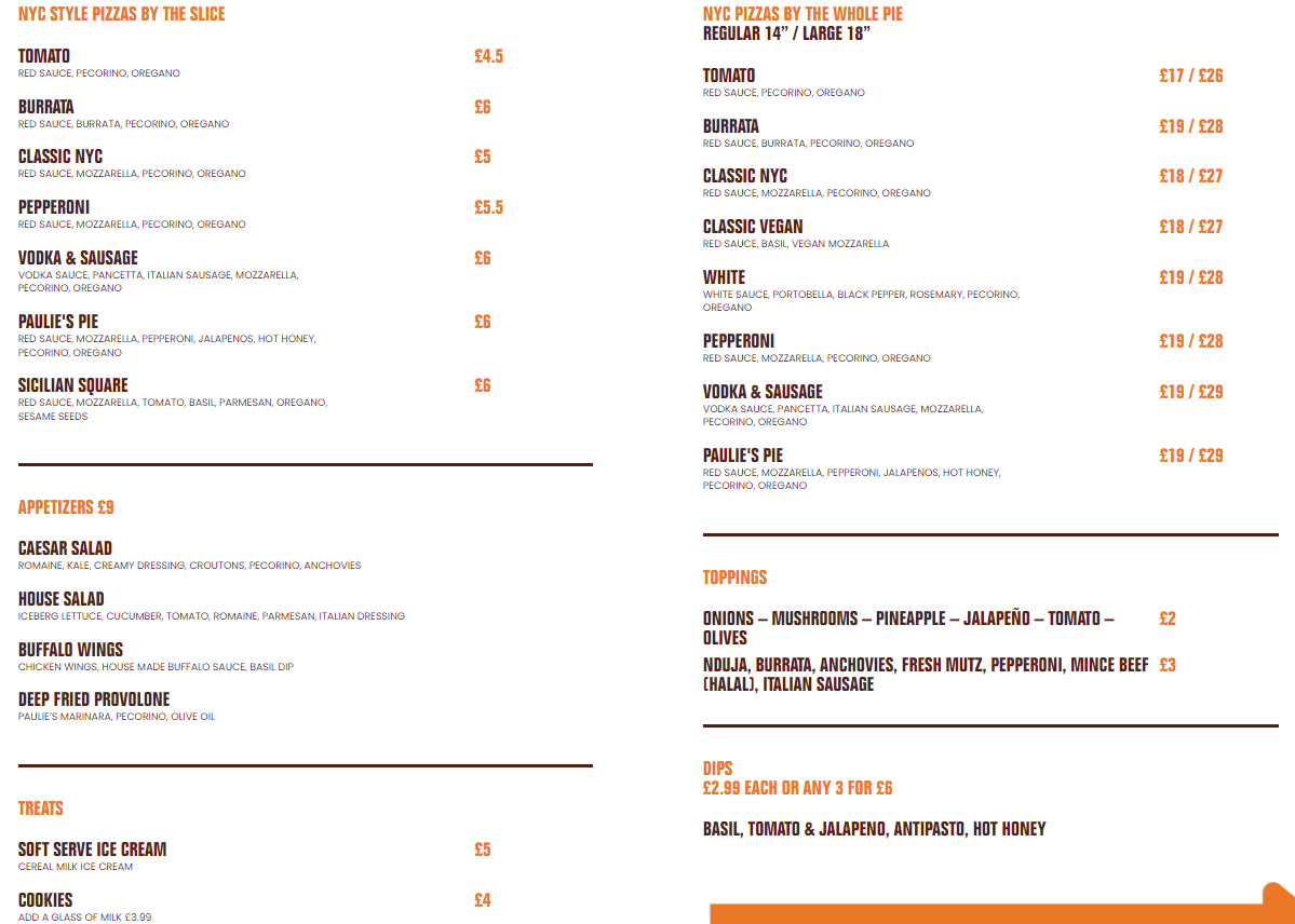 The menu focuses on NYC-style pizza, available by the slice or whole pie, with standout toppings like vodka and sausage, burrata dollops, and other indulgent combinations. Paulie’s also serves soft-serve ice cream and classic sides, rounding out its Americana-inspired offering. Though still relatively new, incorporated in early 2025, the spot has quickly gained attention for its bold flavours and nostalgic charm.