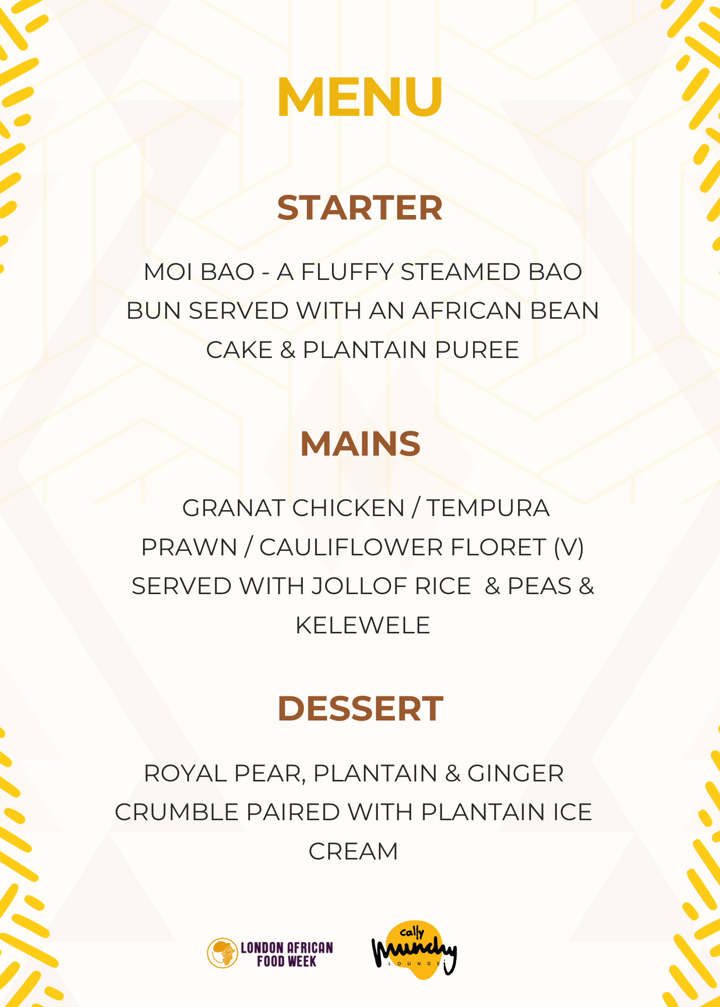 Trained at the De Vere Academy and Pinsent Masons, Chef Ebenezer brings his expertise to the table as we jointly present a meticulously crafted three-course meal, spotlighting the beloved plantain in a myriad of delectable formats. Get ready for an unforgettable fusion of flavours and culinary innovation!