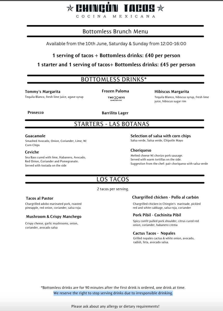 With this ticket you are purchasing the £45 bottomless brunch menu: 1 serving of tacos per person + 1 starter +Bottomless drinks (Tommy's Margarita, Frozen Paloma, Hibiscus Margarita, Prosecco, Barrilito Lager). Starters: Guacamole Selection of salsas with chips Choriqueso Ceviche Selection of tacos are: Al Pastor Tacos Chargrilled chicken Tacos Pork Pibil Tacos Cactus Tacos Mushroom & Crispy Manchego |