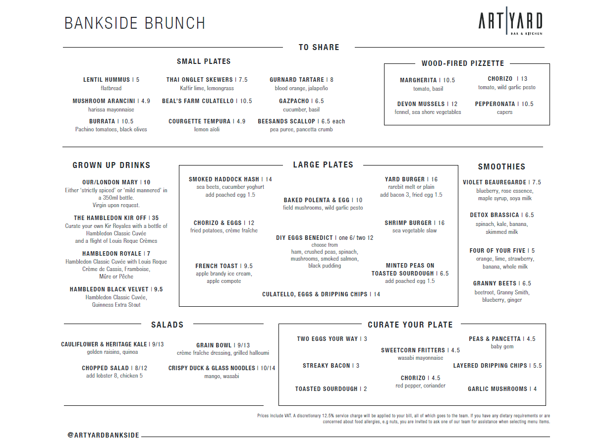 Swing by at the weekend to enjoy the art and brunch at Art Yard. The restaurant at Bankside Hotel takes a decidedly creative view on brunch; the classics you’d expect are served with a twist, ’Curate Your Own Plate’ allows you to mix it up a bit to suit your style. Then there are small plates, sharing dishes and full-on dishes that veer from the norm, but all use fresh top-quality ingredients that are the heroes on the plate or in the bowl. Healthy, naughty, vegan, gluten-free, as you’d expect we’ve got it all covered