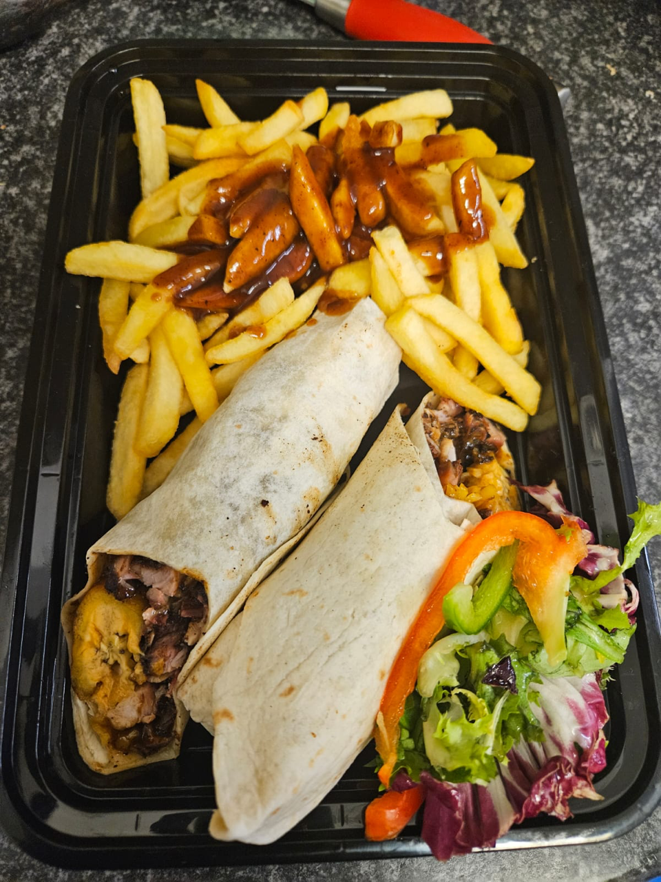 Any selection of food from a food vendor in the yard.