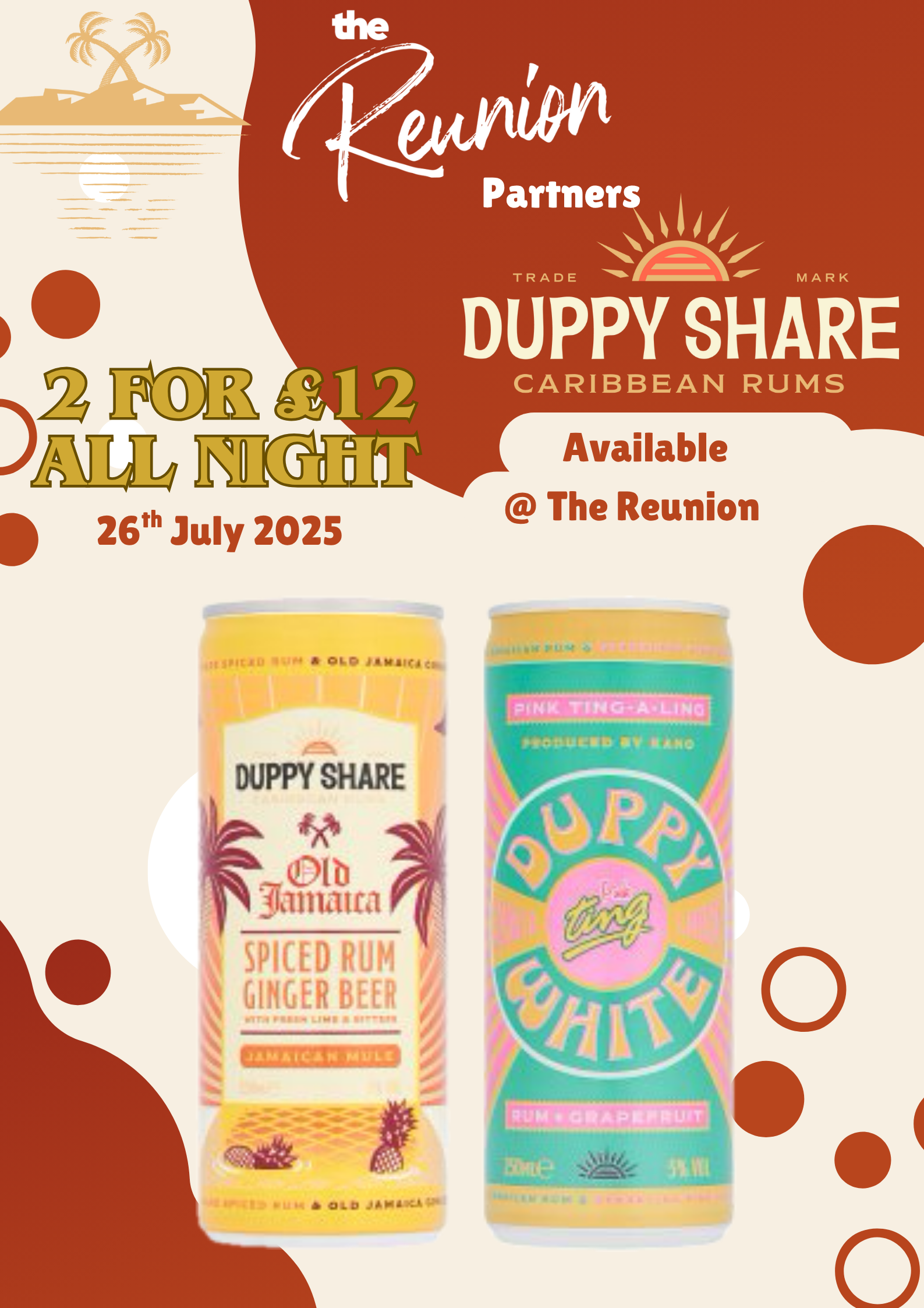HAPPY HOUR WILL COMMENCE PROMPT FROM 3PM - 5PM FOR 2 HOUR WHICH WILL BE BUY ONE GET ONE FREE ON select Duppyshare COCKTAILS and 2 for £12 on Duppyshare Summer cans.