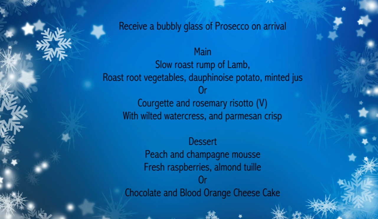 Upon arrival you will be warmly greeted with a bubbly drink, followed by a sumptuous two course dinner.