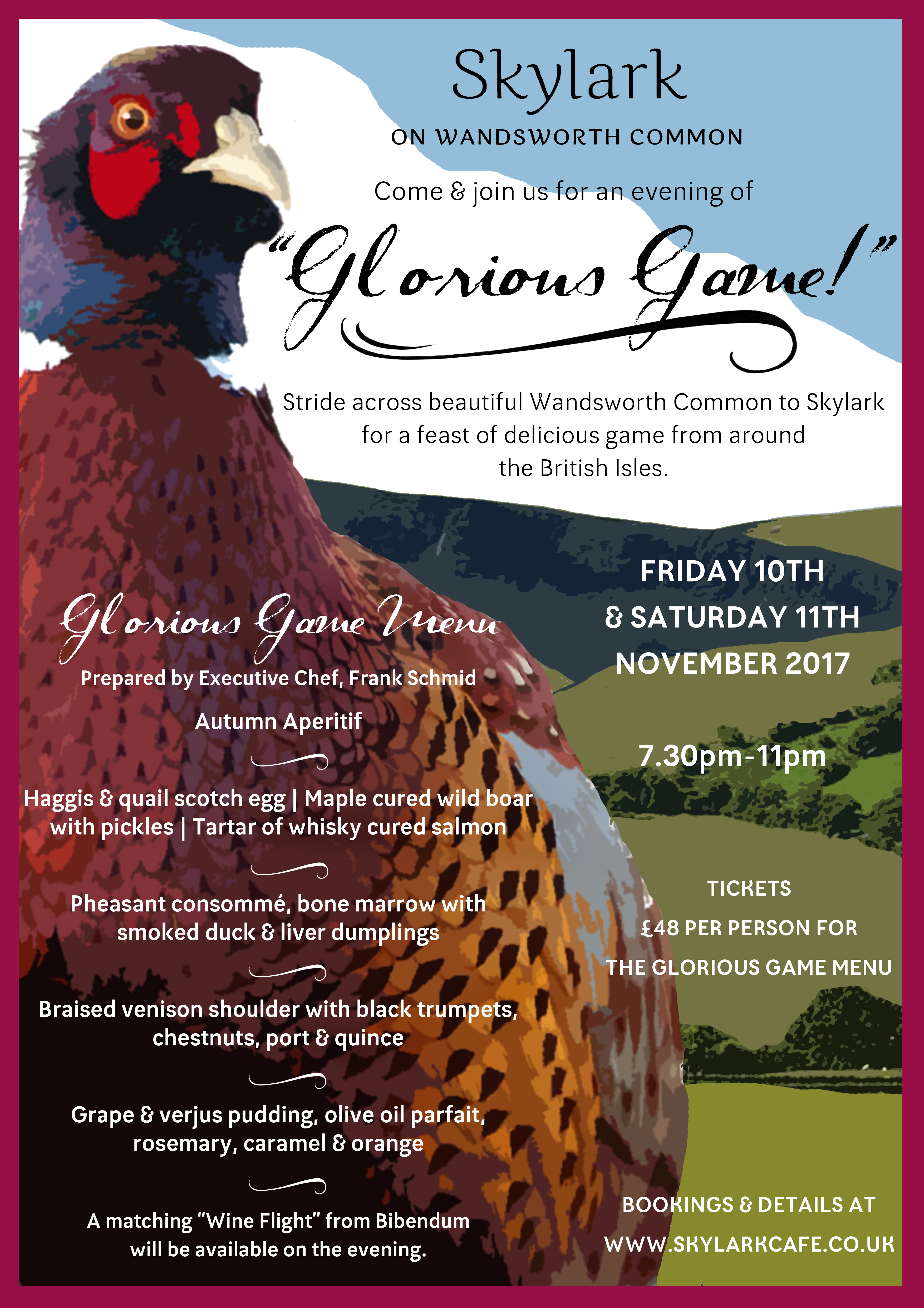 "Glorious Game!" Autumn Pop-Up Supper at Skylark on Wandsworth Common