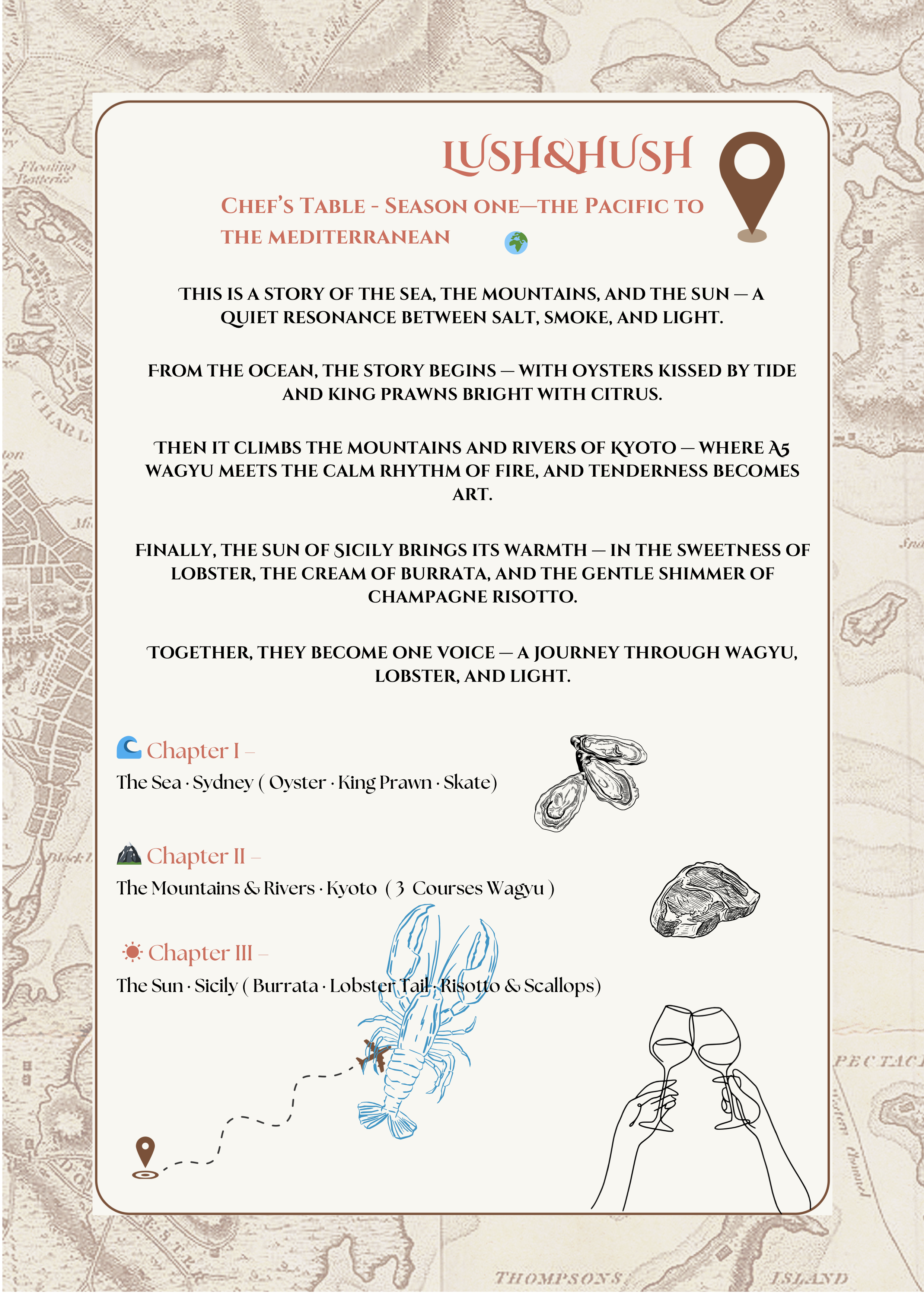 Every two months, the LUSH & HUSH Chef’s Table opens a new chapter —a nine-course tasting journey that travels through the flavours, stories, and landscapes of three destinations around the world.