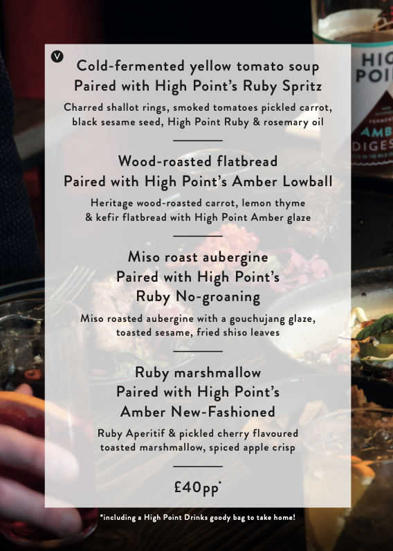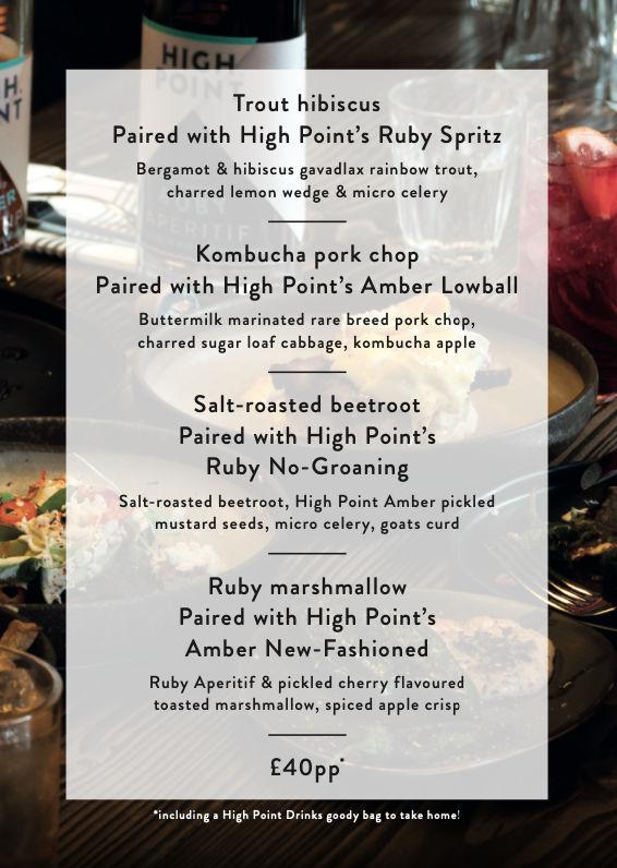 There will be 2 set menus to choose from, each filled with 4 incredible courses paired with 4 delicious High Point non-alcoholic cocktails. Plus, you'll take away a High Point Drinks goodie bag with you!