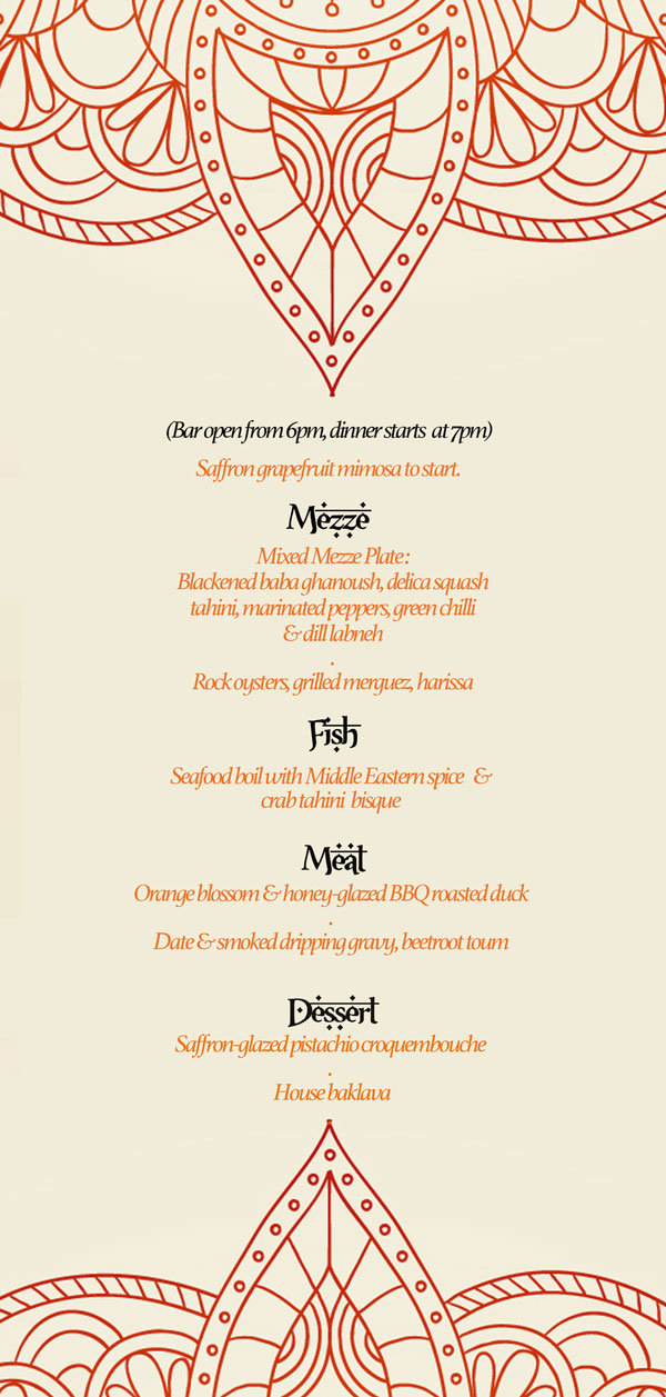 Our NYE celebratory tasting menu will be a banquet fit for a king and his mistress, spread across the entire table for shared feasting. The meal will start with oysters and grilled merguez, followed by a selection of our favourite mezze to include blackened baba ghanoush, Delica squash tahini, grilled marinated peppers and labneh with green chilli and dill. Our fish course combines our love for American soul food and Middle Eastern ingredients. We’ve always wanted to cook our version of a crayfish boil, and this party seemed like the perfect opportunity to do so. Accompanying the crayfish will be whole crab, prawns and mackerel tails served with a crab bisque tahini – all to be eaten, as it should be, with your hands. For our main course there will be honey and cardamom-glazed rotisserie duck with date and smoked dripping gravy and beetroot toum. Our dessert, a tribute to a classic French dish reserved only for special occasions, will be a saffron-glazed pistachio croquembouche tower presented directly on the table filled with sparklers (because it’s New Years Eve and the only night of the year we can get away with such OTT 1980s ridiculousness).