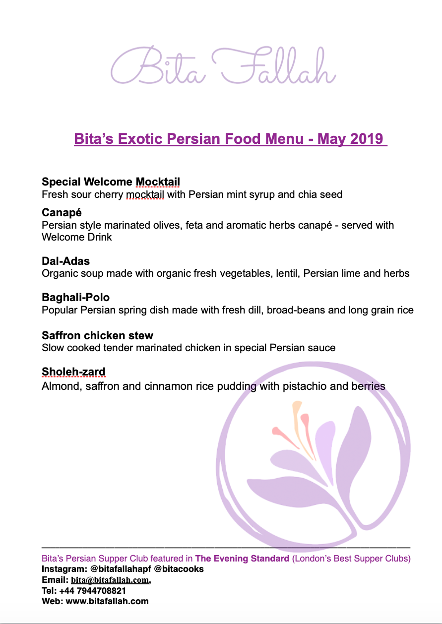 Enjoy subtle and exotic Persian cuisine prepared by Bita Fallah - the renowned TV Chef – who has been hosting award winning Supper Club across London for the last five years.