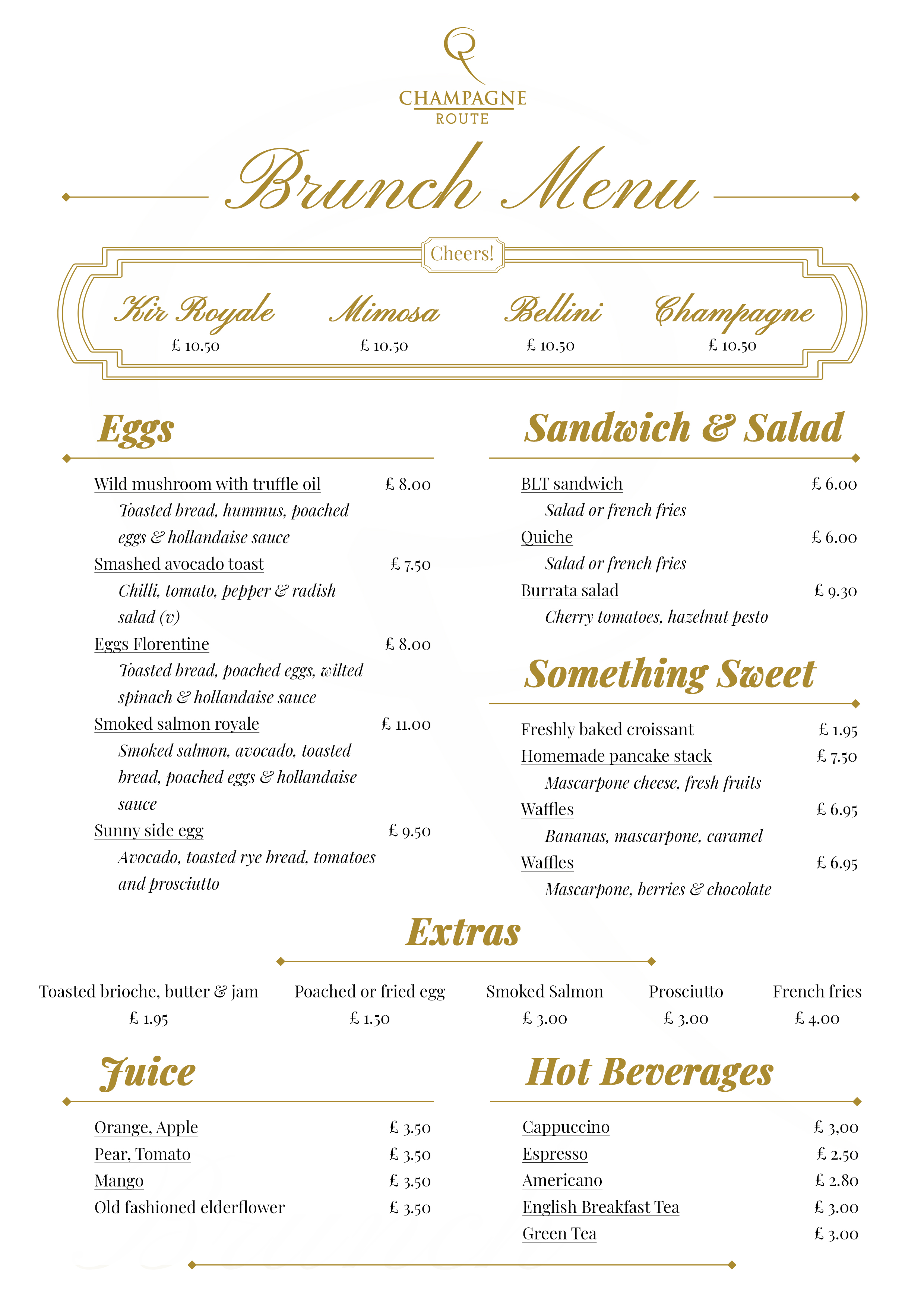 WEEKENDS REALLY AREN'T COMPLETE WITHOUT A LITTLE BOTTOMLESS BRUNCH. HERE @ CHAMPAGNE ROUTE WE OFFER A CLASSIC SPREAD , YOU CANE EXPECT ALL THE TRADITIONAL FAVOURITES - FROM PANCAKES, DELICIOUS WAFFLES TO POACHED EGGS.