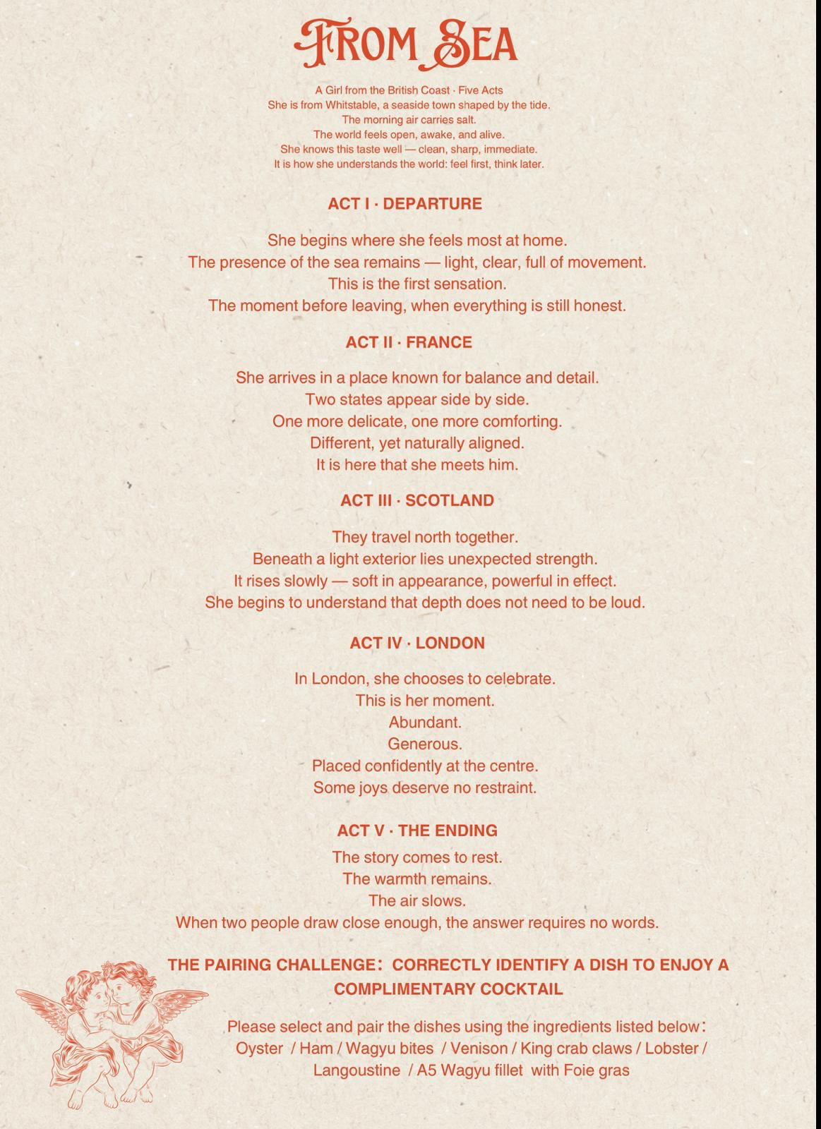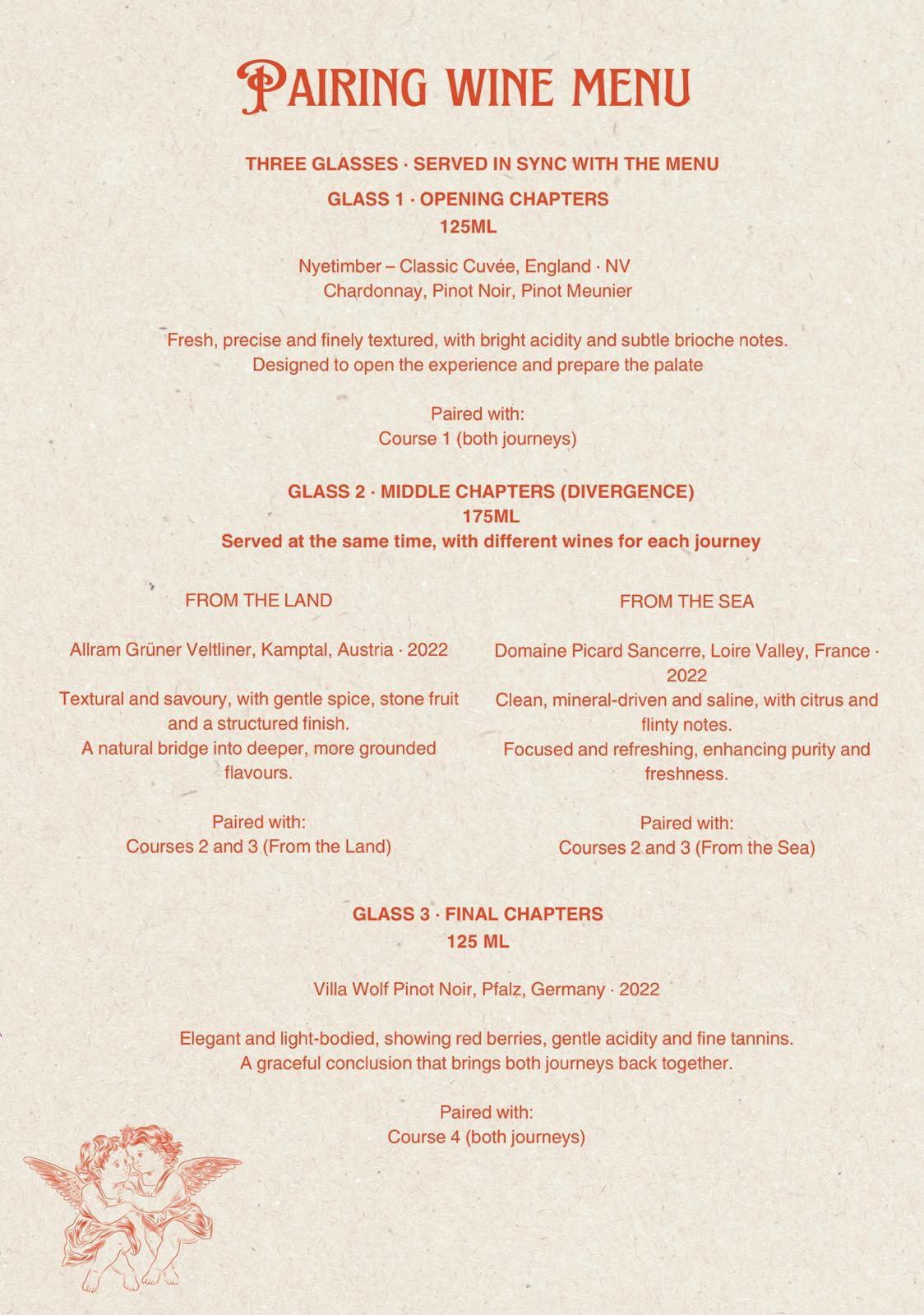 Your menu unfolds as a story told in five chapters, inspired by two journeys —