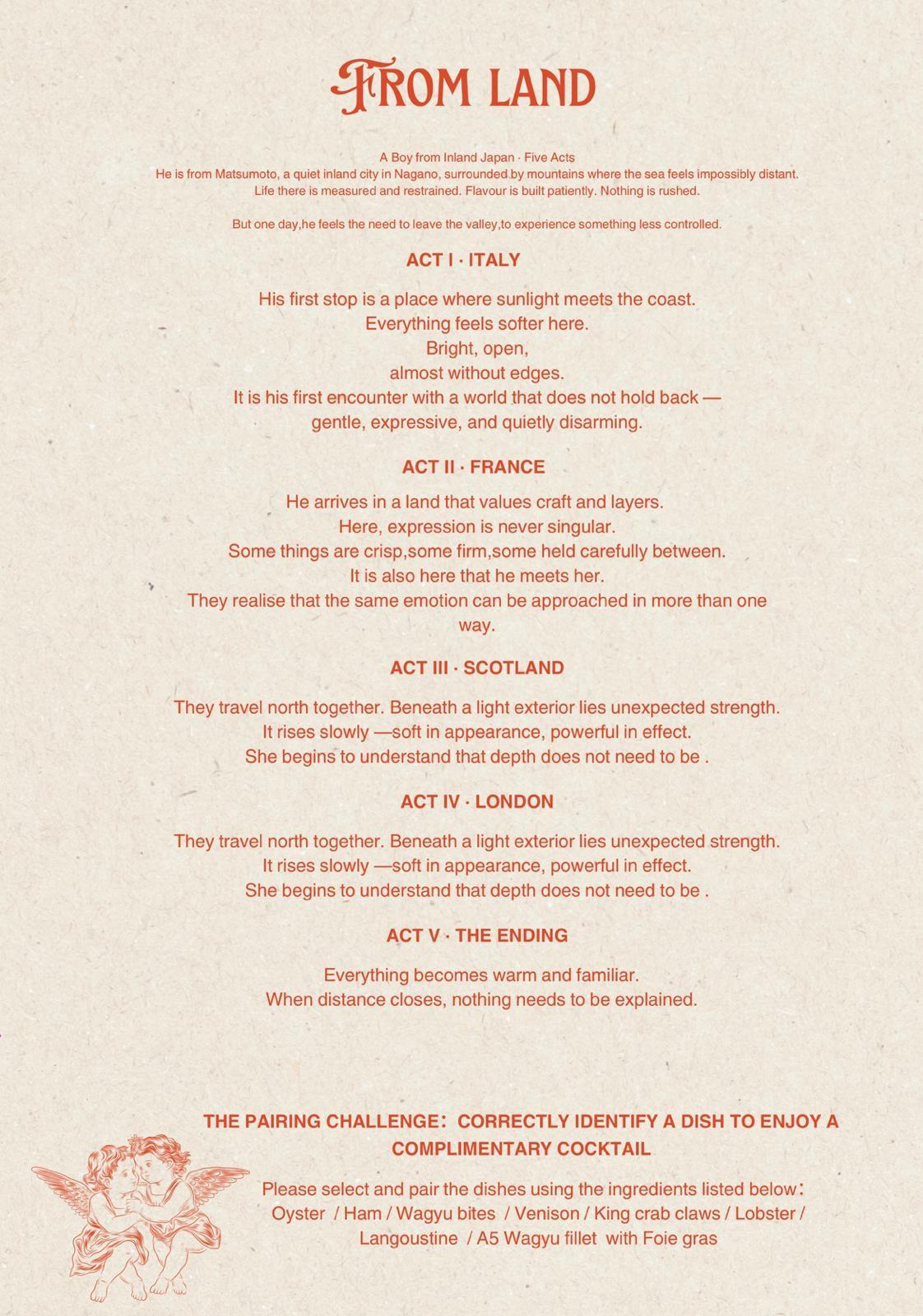 A surprise menu inspired by land and sea, revealed chapter by chapter.