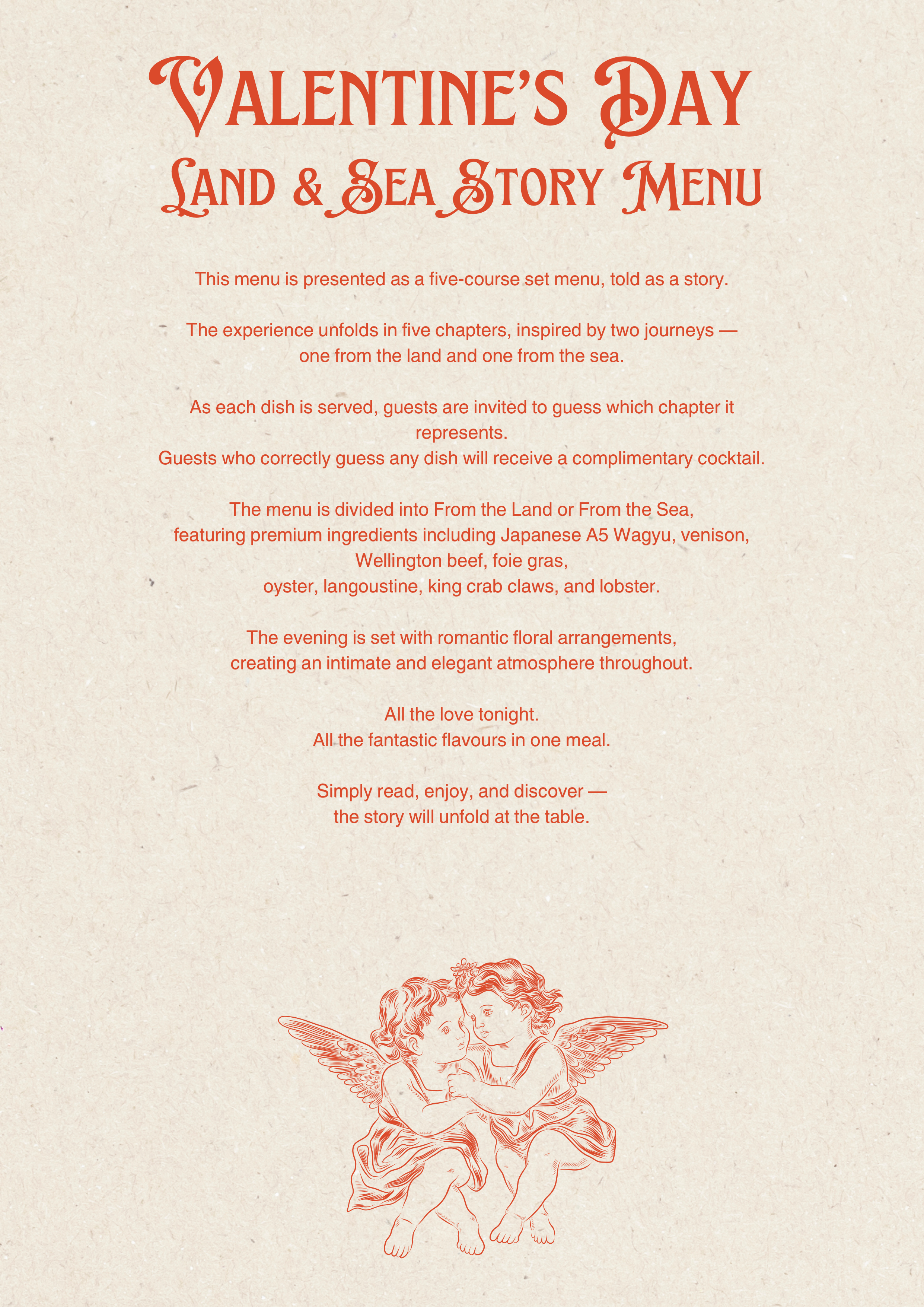Second Seating · 8:30 pm onwards The Second Seating is designed for those who prefer a later, more atmospheric evening. As the night deepens, the five-course story menu unfolds at a natural, flowing pace, allowing the experience to linger and breathe. This seating is ideal for guests who enjoy a more relaxed finish, with time to immerse themselves in the narrative, the flavours, and the shared moments at the table. The dining room settles into a warmer rhythm, with soft lighting and romantic floral details enhancing the sense of intimacy. Guests are encouraged to take their time, engage with The Ingredient Guess, and enjoy the wine pairing as the story reaches its final chapters. Perfect for couples seeking a slower, more indulgent Valentine’s night, where the evening is allowed to unfold without watching the clock. |