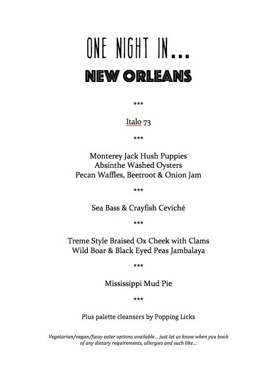 Your First Class ticket includes a welcome cocktail, canapés and a 3 course dinner - including Monterey Jack Hush Puppies, Absinthe Washed Oysters, Pecan Waffles with Beetroot & Onion Jam, Sea Bass & Crayfish Ceviché, Treme Style Braised Ox Cheek with Clams, Wild Boar & Black Eyed Pea Jambalaya and rounding things off with our Mississippi Mud Pie. (vegetarian/vegan/fussy eater options are available)