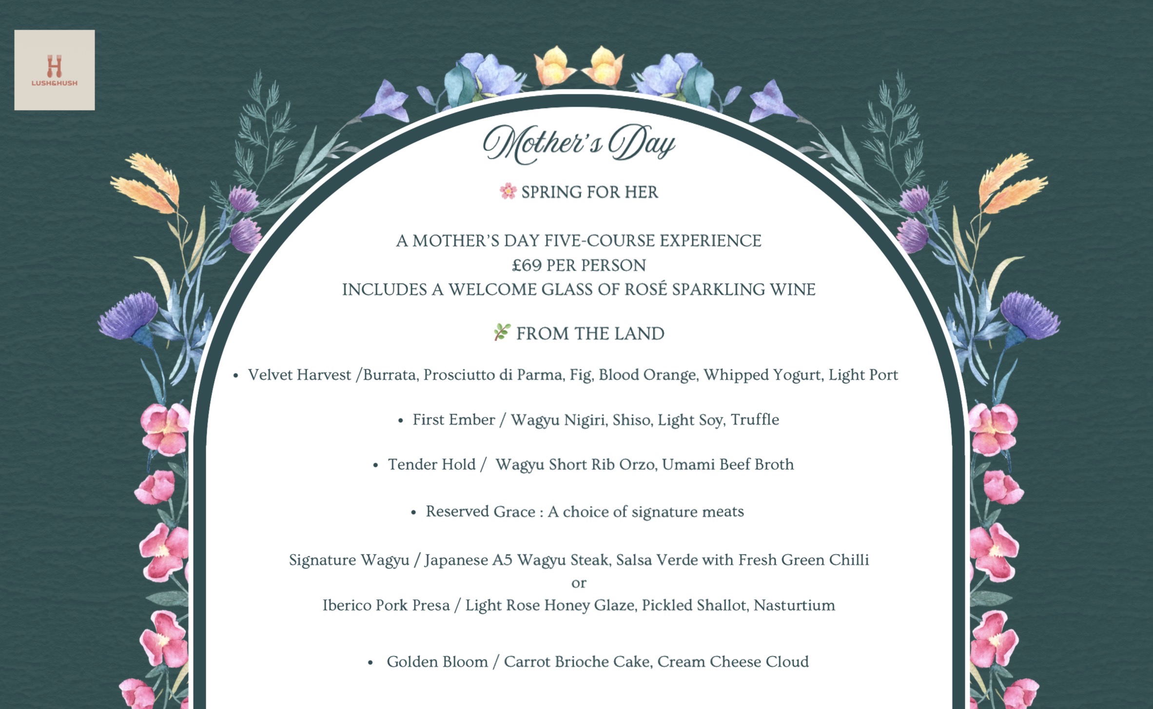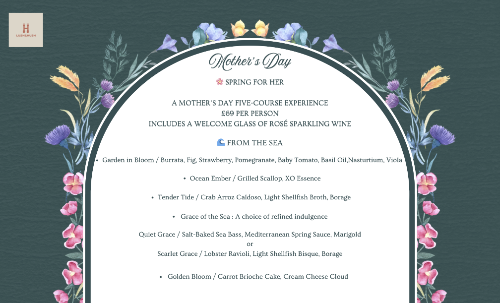 Mother’s Day Dining Experience Spring for Her – Five-Course Menu Celebrate Mother’s Day at LUSH & HUSH, Notting Hill with our specially curated Spring for Her five-course dining experience. Inspired by the freshness of spring and the warmth of family gatherings, this menu highlights seasonal flavours, delicate seafood, premium Wagyu and elegant desserts. Guests may choose between two culinary journeys — From the Sea or From the Land — with refined dishes created to celebrate this special occasion. Each guest will be welcomed with a complimentary glass of rosé sparkling wine to begin the celebration. Join us for a relaxed and elegant Mother’s Day lunch in the heart of Notting Hill, just a short walk from the iconic pastel townhouses. Early Lunch Seating 11:30 AM – 1:00 PM This is our early seating. Guests are kindly requested to arrive on time for their reservation. Your table will be reserved until 1:00 PM, as the next seating will begin shortly after. The five-course dining experience is designed to be enjoyed comfortably within this time frame, with the courses served over approximately one hour. Important Information • This event is ticketed and prepaid. • Each ticket includes the five-course Mother’s Day menu and a welcome glass of rosé sparkling wine. • The dining experience lasts approximately 90 minutes. • Please arrive on time for your selected seating to ensure a smooth service. • Seating may be arranged depending on party size and table availability. • Unfortunately we may not be able to accommodate late arrivals beyond the seating window. ⸻ Dietary Requirements If you have any allergies or dietary requirements, please inform us in advance when booking so our team can assist where possible |