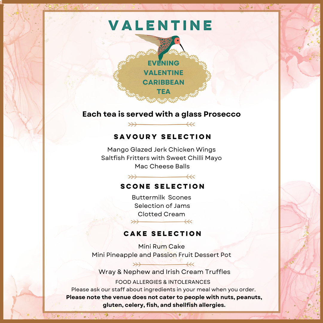 Whether you're loved up or celebrating "Gallentine" with your friends, join us on the 14th of February for a late Caribbean tea experience. Feast on yummy mango-glazed Jerk Chicken Wings, Saltfish Fritters, Mac Cheese Balls, and more tasty bites. Sip on a glass of prosecco and end the night with Wray and Nephew and Irish Cream truffles.