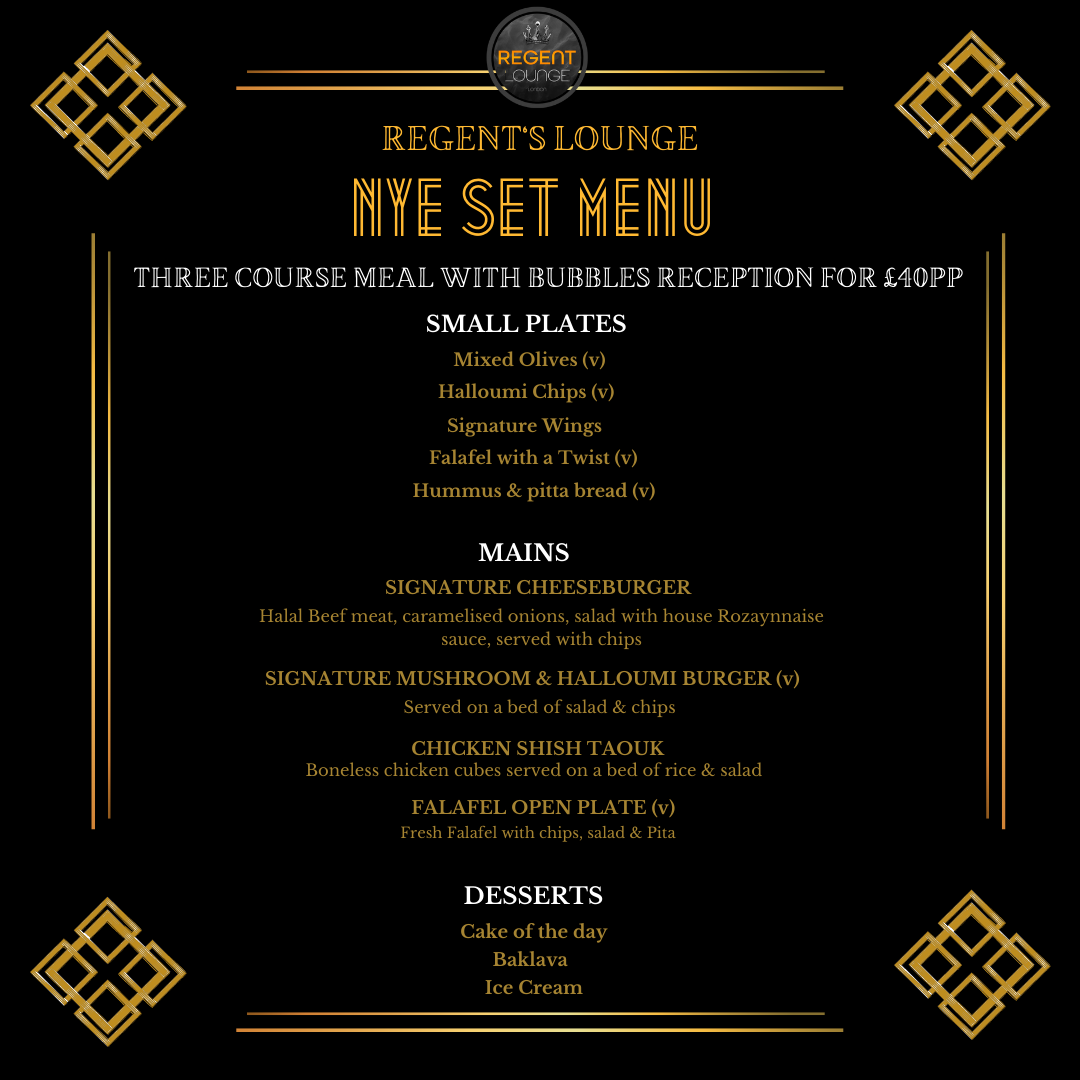 With 2023 around the corner, we want to invite you to our biggest New Year's Eve party celebration! You will be welcomed with a glass of bubbles and a lively atmosphere where you can expect Afrobeats, R&B, HipHop, and Rap from the best UK DJs. Table bookings are recommended to eat, drink, and shisha as general standing tickets can only order drinks from the bar. You will be offered our exclusive New Year's Eve Set Menu which includes a three-course meal (starter, main, and dessert) for £40 per person. All our foods are halal and we offer vegetarian and vegan options but please consult our staff for any other dietary requirements. The minimum spend for a table is £100 per head which includes any food, drinks, shisha, or drinks package orders. We require a prepayment to secure your bookings to avoid any complications on the night. Party all night until 5 am!