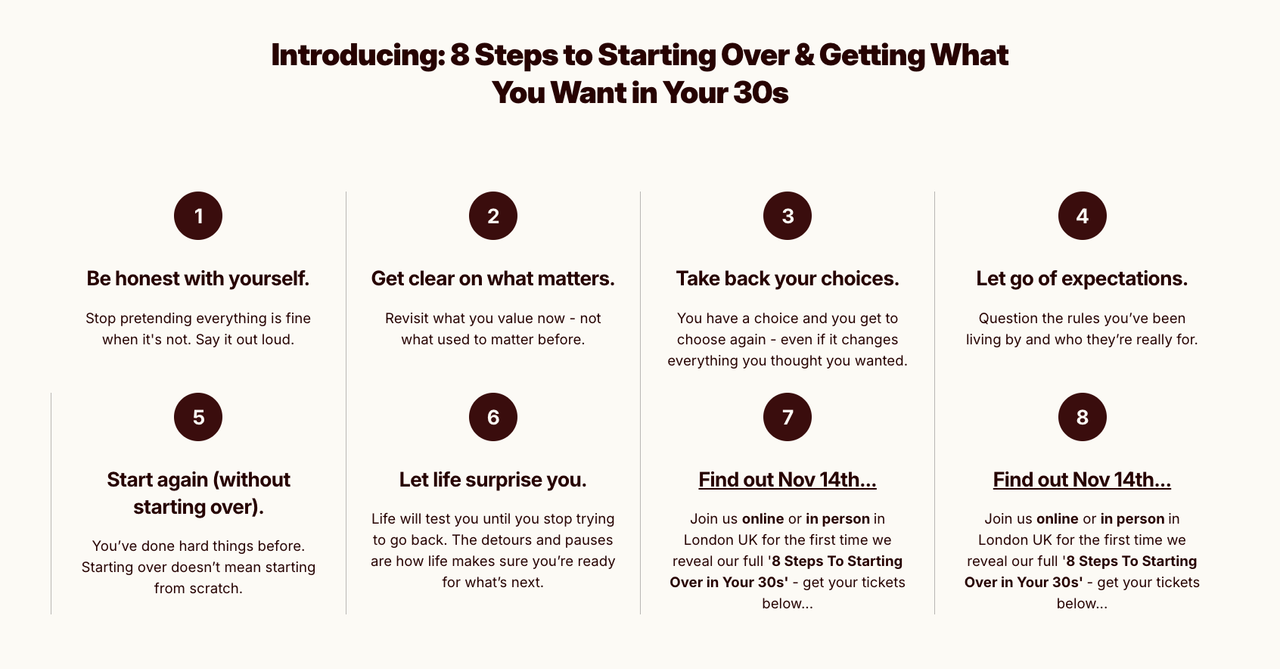 Join Her Thirties co-founder Bianca Skeete live online for The 8 Steps to Starting Over in Your 30s — an honest, unfiltered guide to rebuilding when life stops fitting. We’ll unpack eight simple steps for women ready to begin again, from clarity and confidence to creating a life that finally feels like yours. It’s less “start from scratch” and more “start from now.” You don’t need to have it all figured out. Just show up as you are - we’ll do this together. |