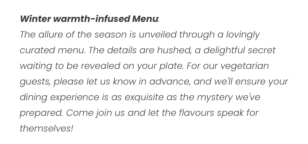 A six-course Persian feast awaits, each dish crafted with special ingredients and a generous sprinkle of love. The enchanting notes of beautiful Persian music serenade you, while the warmth of Persian hospitality embraces you throughout the night.