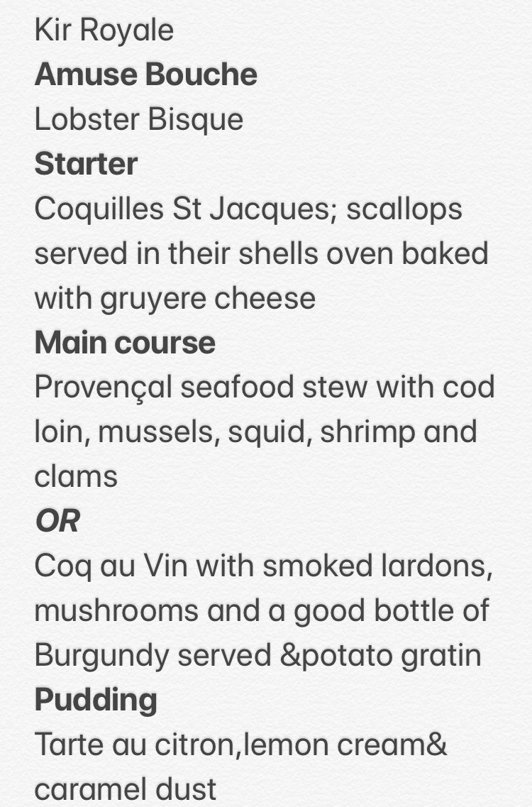 The Provençal menu is devised to transport even if only for an evening to Southern France 🇫🇷 and French cuisine that is reminiscent of balmy summer evenings by the sea. BYOB and we provide the rest including water, ice, a welcome cocktail and digestif.