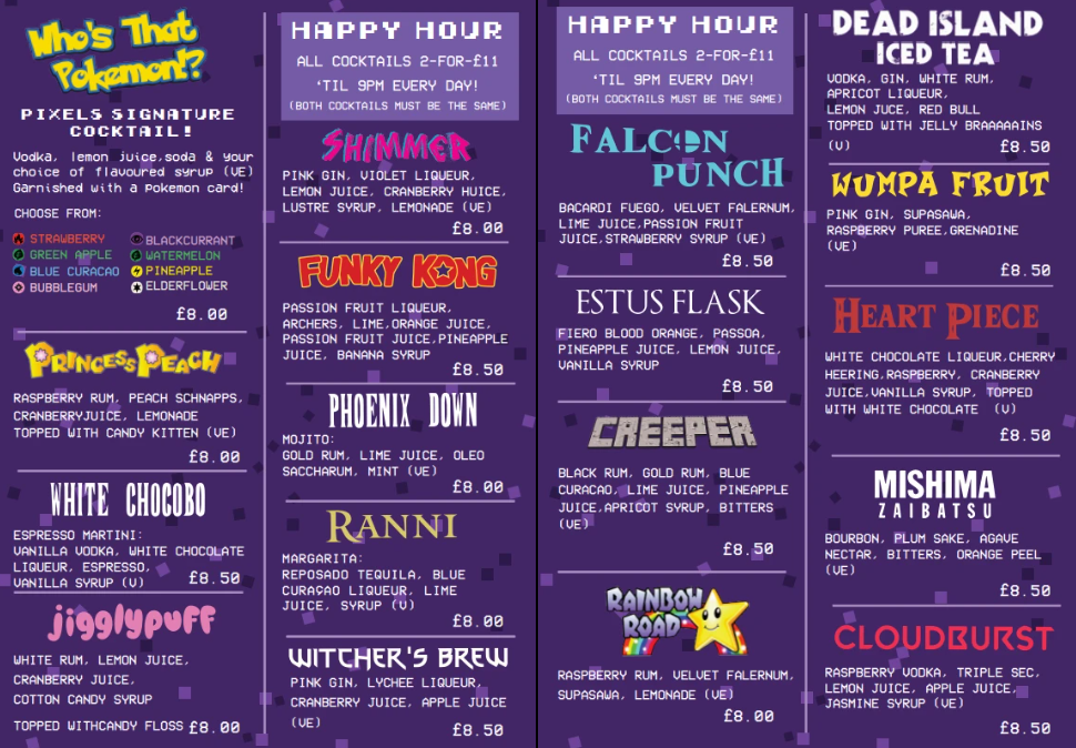 The hungry and the thirsty are kept at bay with quirky themed cocktails, Pixel Bar even offering their own Pokemon themed cocktail menu with drinks from as little as £8. Happy hour? See it running until 9pm every day, with two of the same cocktail for £9. Food comes in the shape of loaded fries, pizzas and nachos.