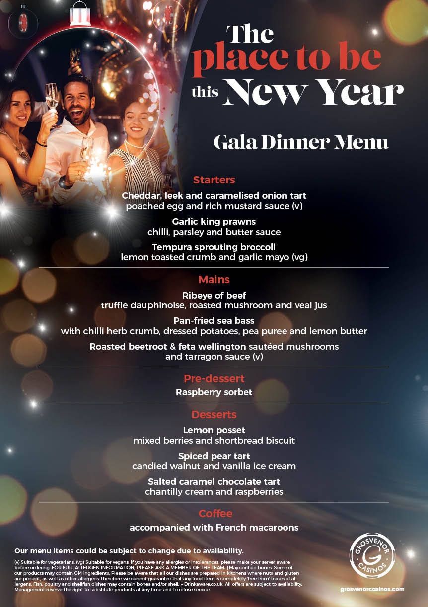 Due to the popularity of our New Years Eve celebrations entry in to the casino will only be permitted with the purchase of a ticket priced at £10 each or why not upgrade to our Gala package and not only enjoy a delicious 5 course Gala Dinner but also guarantee yourself a seat for the show.