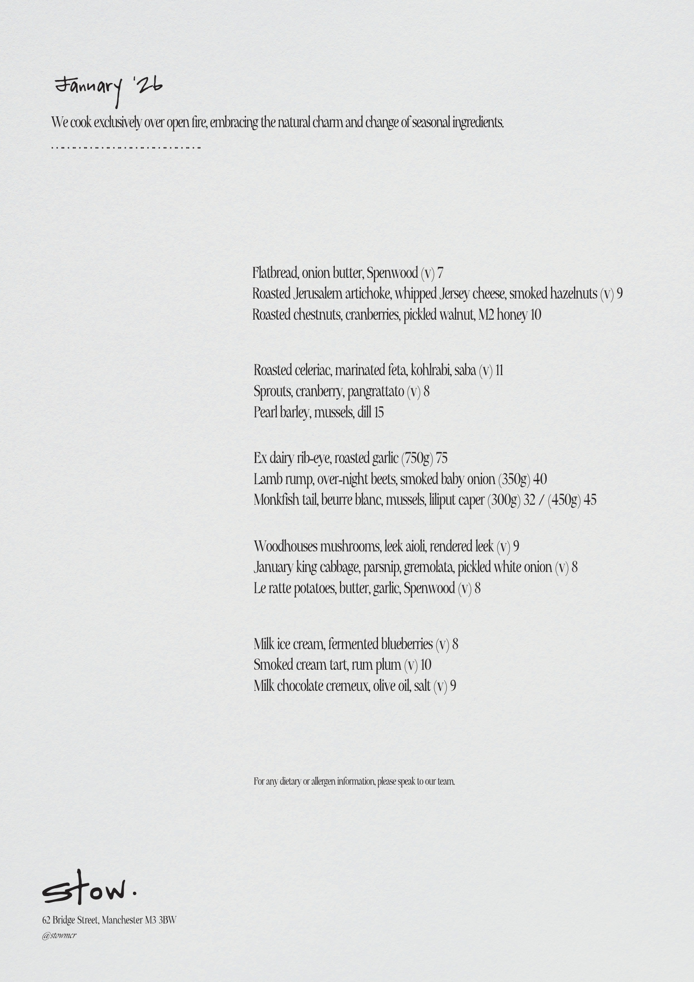 Hidden just off Bridge Street, Stow has quickly become one of Manchester’s most exciting modern dining rooms, bringing fire‑led cooking and laid‑back confidence to the city centre. The space is intimate and unfussy, with the open kitchen taking centre stage so diners can watch flames, embers and grills in constant motion. There’s a sociable front bar for cocktails and wine before or after dinner, but the real magic happens at the counter seats, where the warmth of the fire and the energy of the kitchen create a quietly thrilling atmosphere.