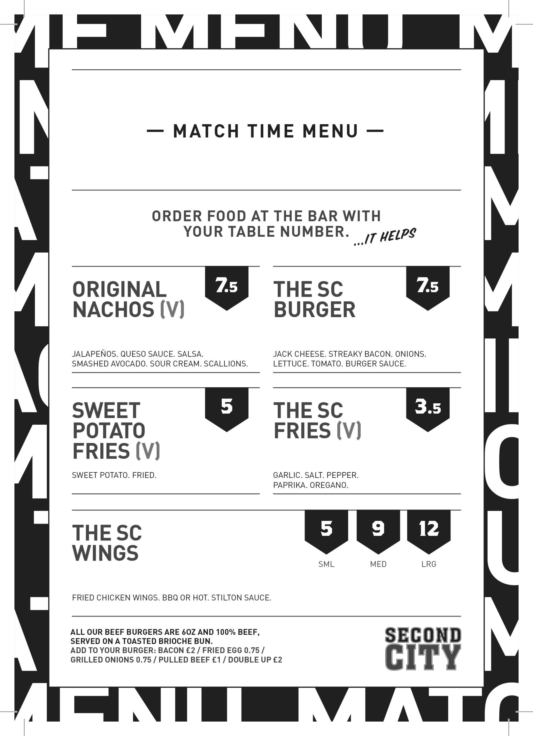 Enjoy the Match Day menu of nachos, wings, burgers and more.