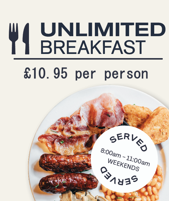 Tuck into sizzling bacon, scrambled eggs, golden hash browns, juicy sausages, tinned tomatoes, mushrooms, black pudding, baked beans, and thick slices of buttered toast with a side of fruit and cereal – all served hot and replenished as often as you like. Pair it with fresh tea, coffee, or juice, and you’ve got a breakfast worth remembering.