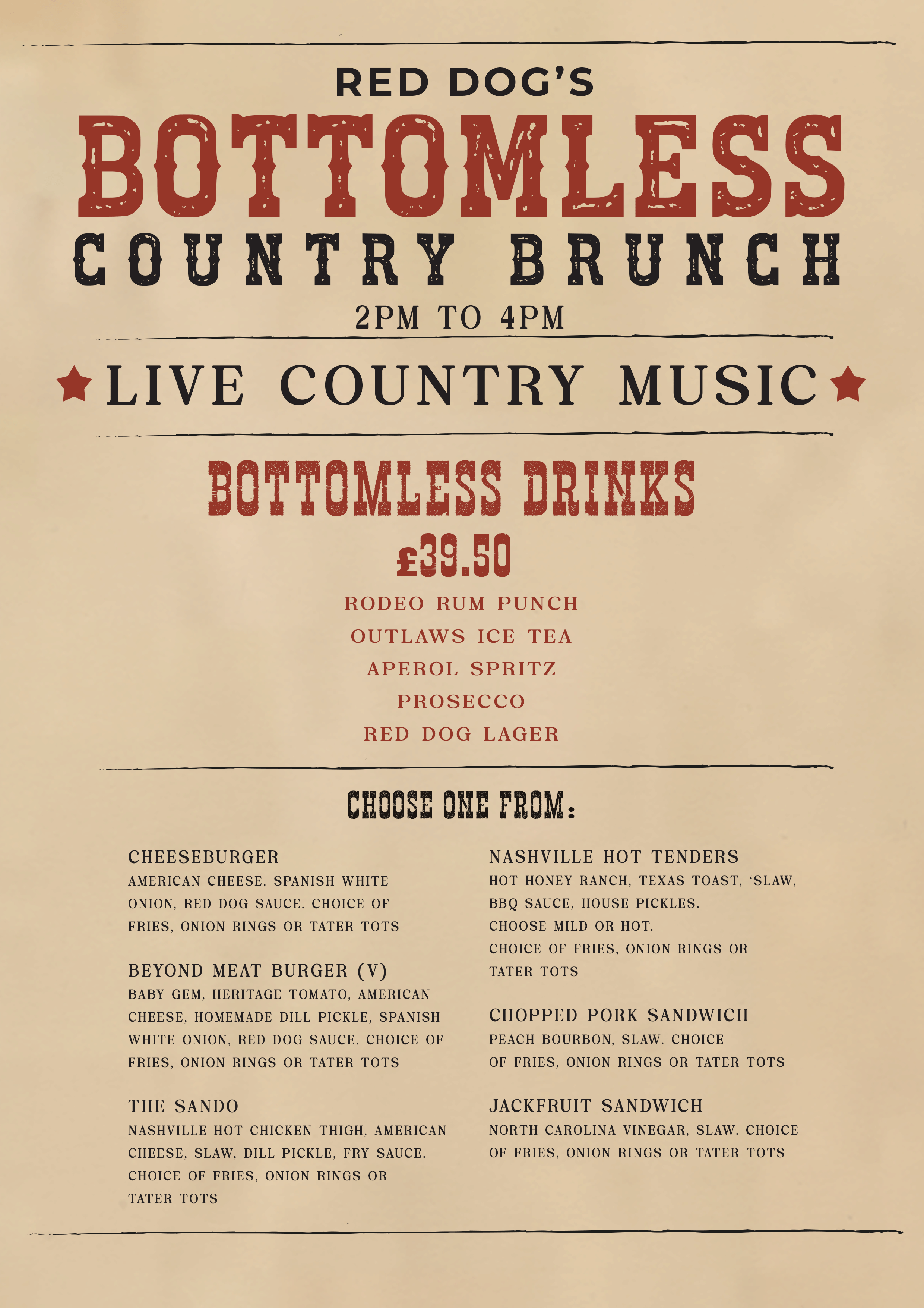 Enjoy bottomless drinks from our brunch menu as well as a choice of food including burgers, BBQ sandwiches and fried chicken.