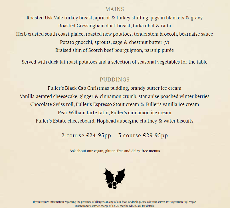 Festive food will be served on the night (pre-order with tickets only) with two options available including a selection of Christmas canapes for £15.99pp or a two course (Mains and Puddings) Christmas meal for £24.95pp