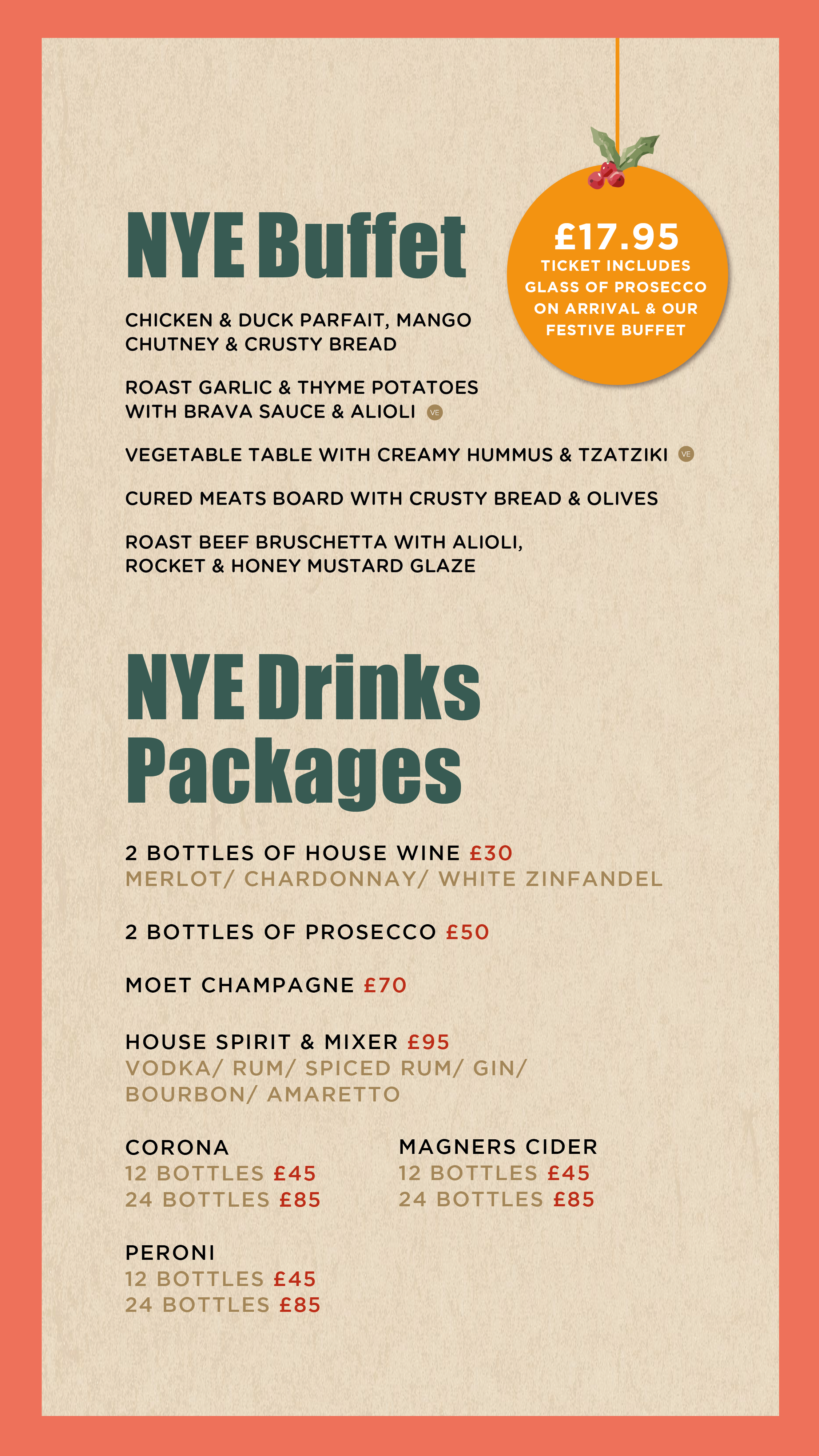 One ticket costs £17.95 and includes entry to the venue, a glass of Prosecco on arrival and food from our New Year's Eve buffet. Once in, you are free to move throughout the decades enjoying the best music and feel good fun from each era!