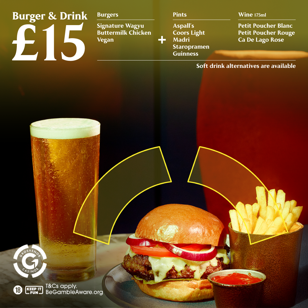 • Choice of a delicious Wagyu burger, Buttermilk chicken burger, or Vegan burger with chips